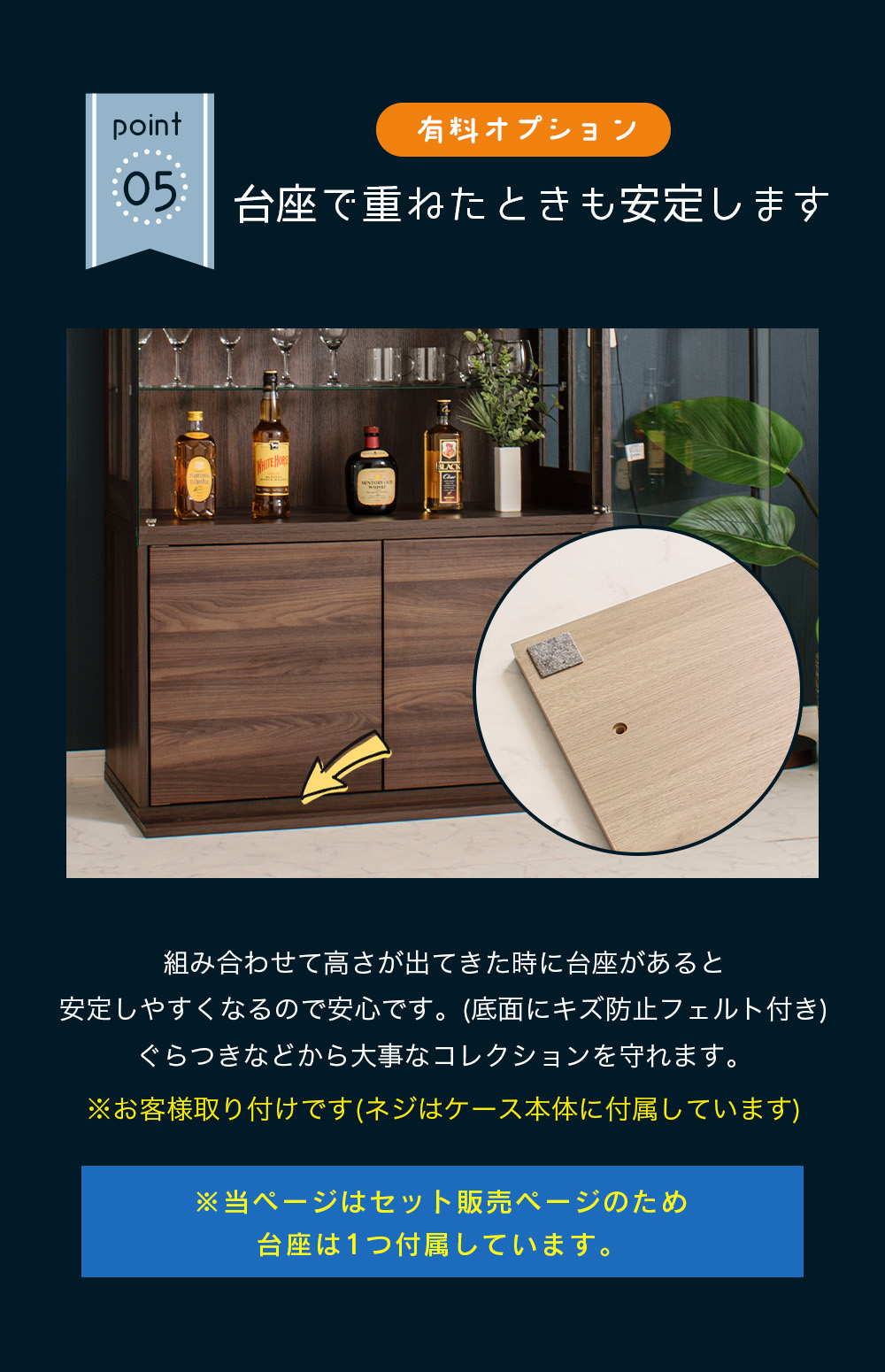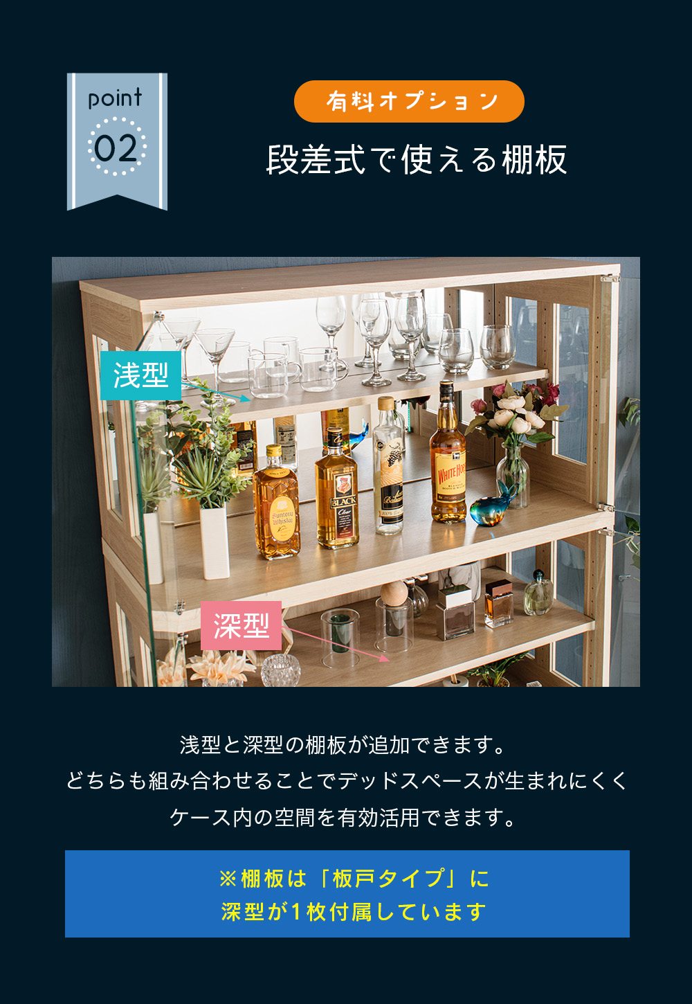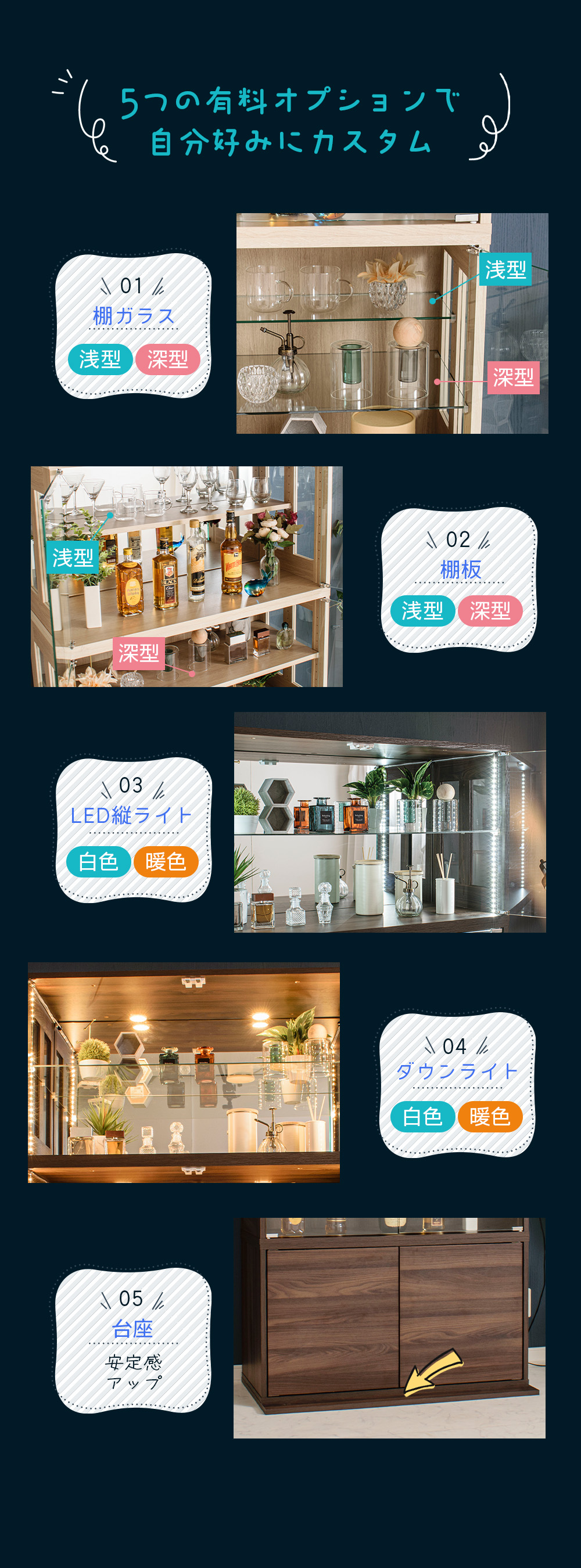 - 豊富なオプションで自分好みにカスタムしやすく、飾る物や使い方に合わせてアップデートできます(追加棚ガラス/追加棚板/追加LED縦ライト・ダウンライト/電源アダプター/追加台座)。