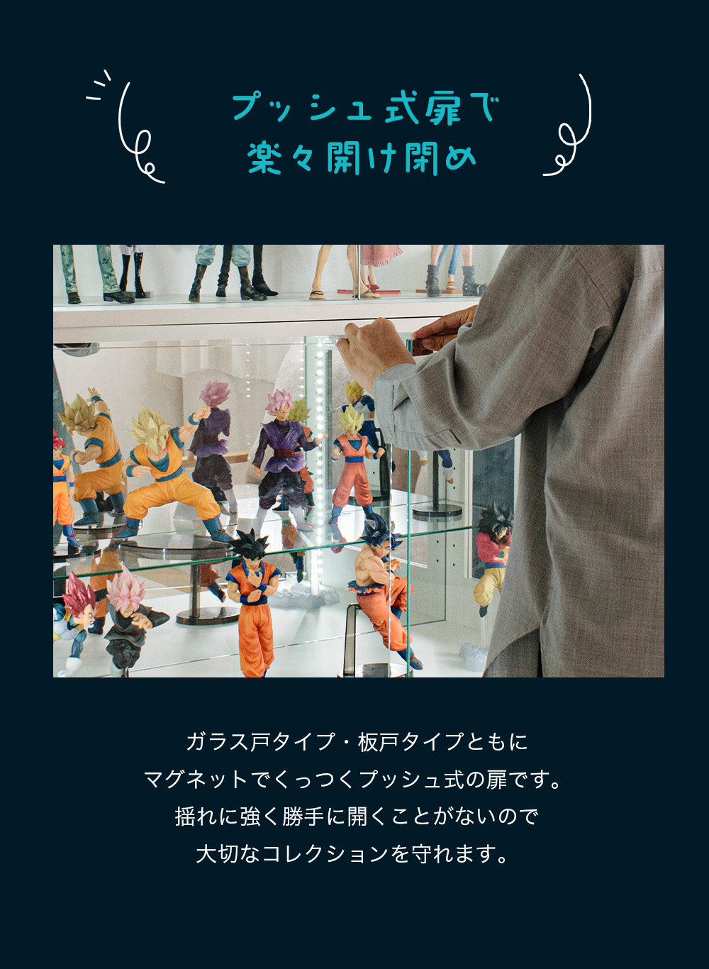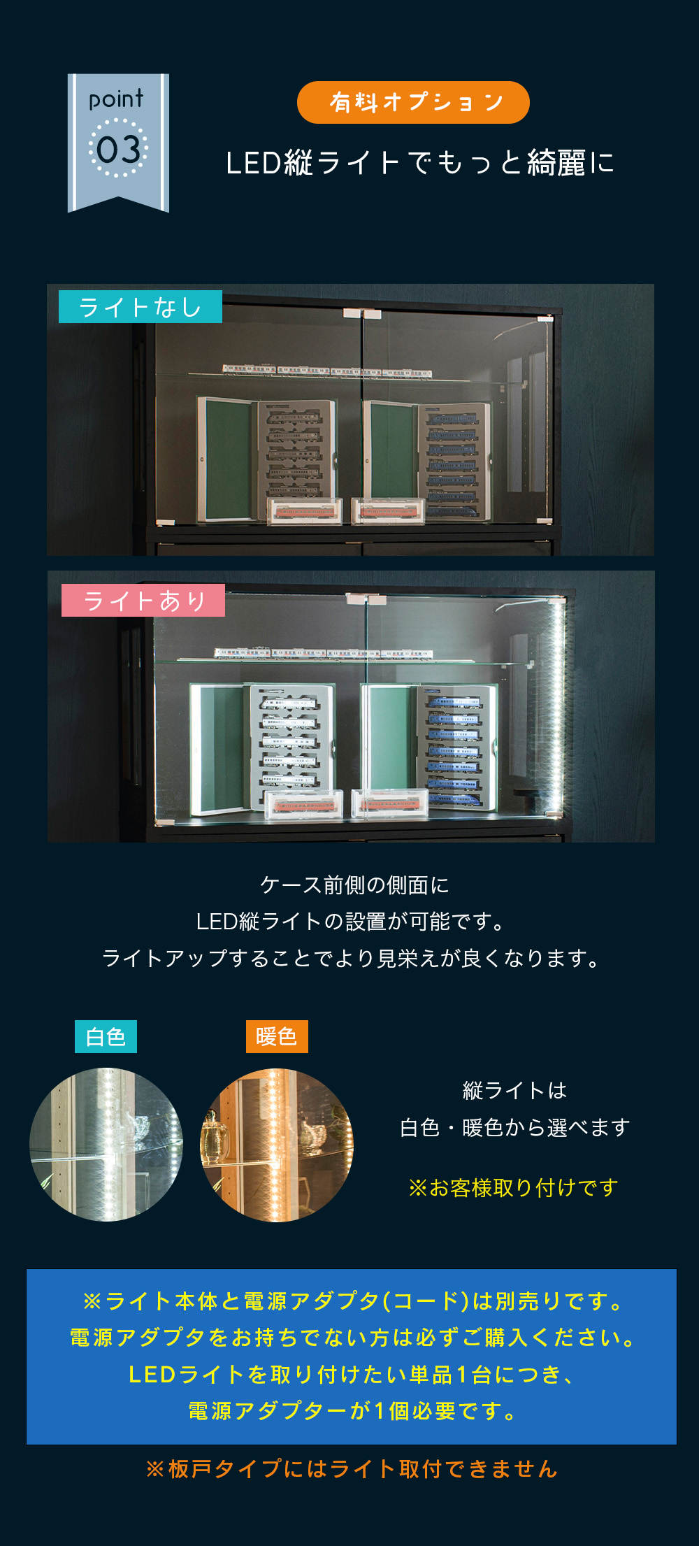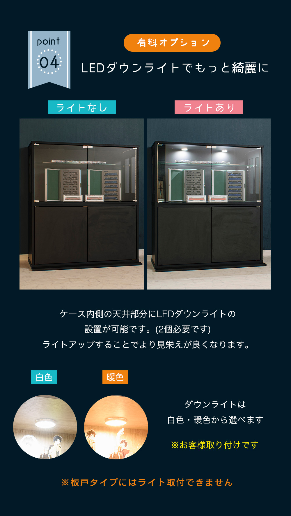 - 豊富なオプションで自分好みにカスタムしやすく、飾る物や使い方に合わせてアップデートできます(追加棚ガラス/追加棚板/追加LED縦ライト・ダウンライト/電源アダプター/追加台座)。