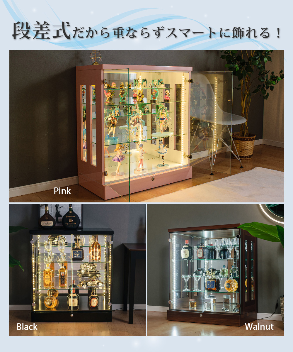 開梱設置付 完成品 段差式 鍵 75 大型 ホワイト ブラック ピンク ブルー ガラスショーケース ガラスケース ガラスキャビネット キュリオケース ディスプレイ 【10%OFF / 期間限定】 コレクションケース フィギュア ケース 段差式 幅75 大型 鍵付き ロータイプ コレクションボード ガラス 収納 棚 鏡面仕上げ ミニカー ガンプラ トミカ ショーケース ポケカ ひな壇 [アーク]