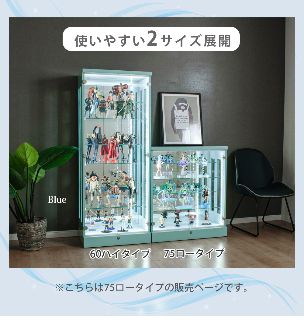 • 幅75cmの大型ロータイプ(本体:約幅75×奥行39×高さ85cm)なので、横幅を活かしてフィギュアやミニカー、ガンプラなどを“ずらっと並べて見せる”ディスプレイが作りやすい