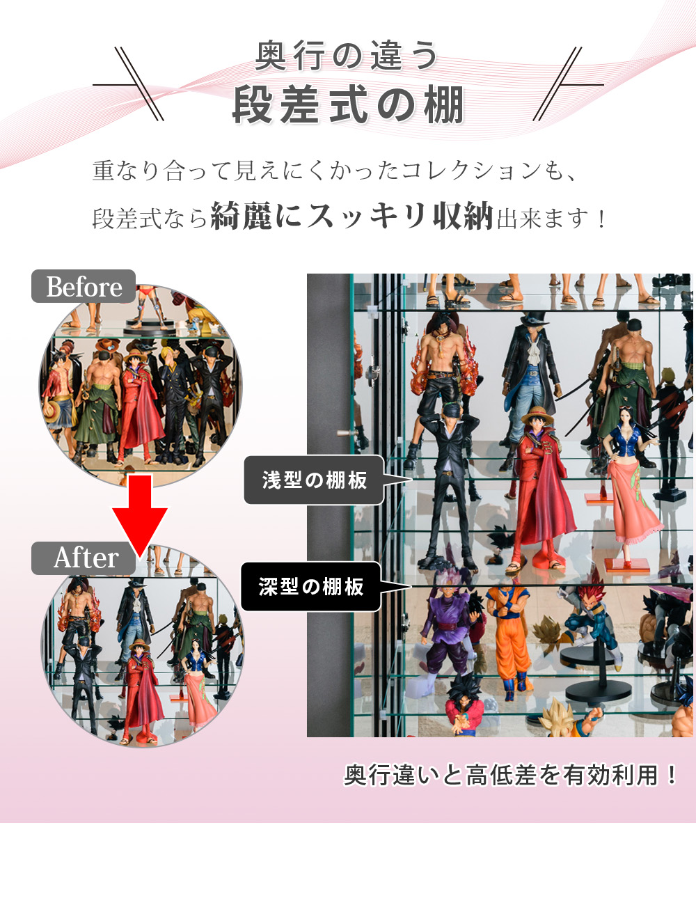 • 段差式(ひな壇)で見せやすい構造なので、奥のアイテムまで視界に入りやすく、展示映えを狙いやすい