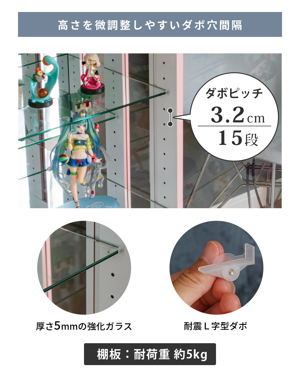 • タボ穴:3.2cmピッチ/15段で棚位置を調整できるため、飾る物の高さに合わせて無駄なく配置しやすい