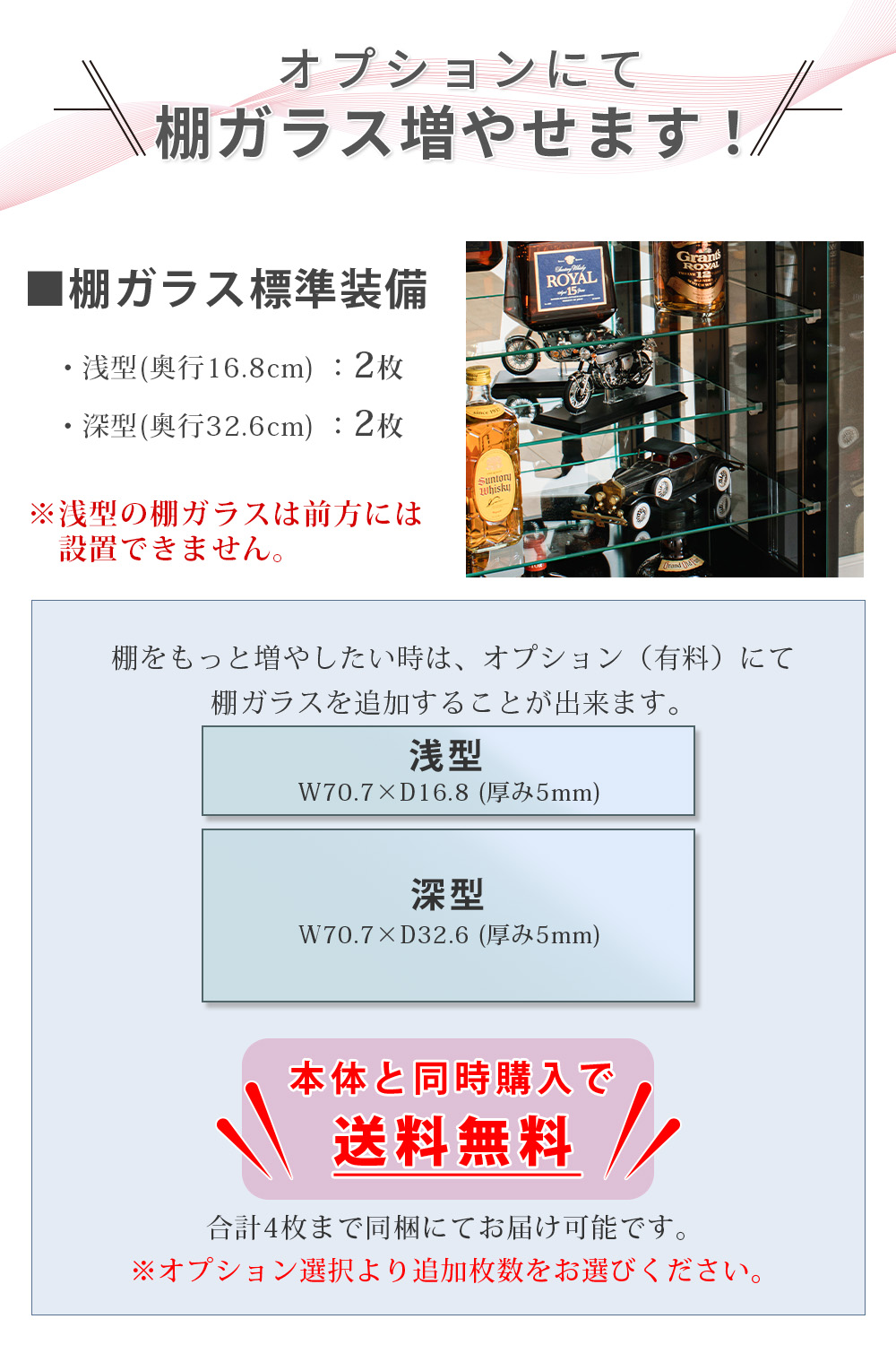 • 棚ガラスは浅型・深型が各2枚標準装備(可動式)で、飾る物の奥行きに合わせてレイアウトを組みやすい