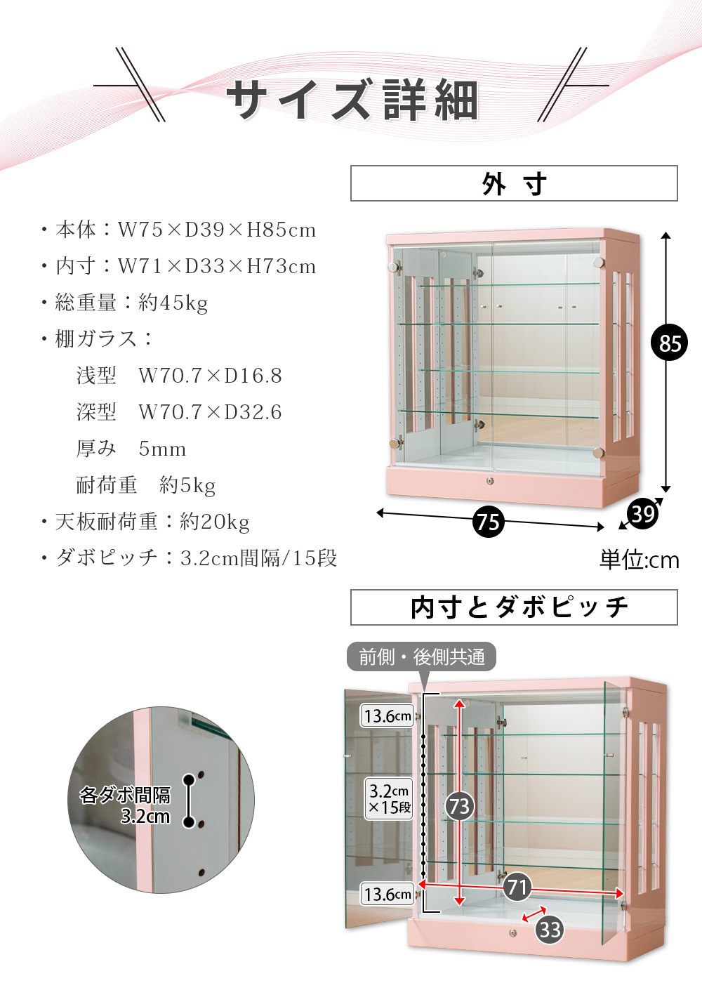 • 内寸:約幅71×奥行33×高さ73cmで、見た目以上に収納スペースがあり、コレクションをまとめて展示しやすい