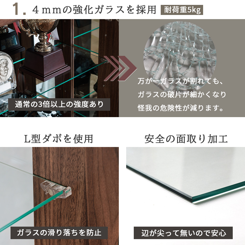 • 棚ガラスは4mm強化ガラスが4枚標準装備なので、買った時点で段数を作れて、整理しながらきれいに並べやすい