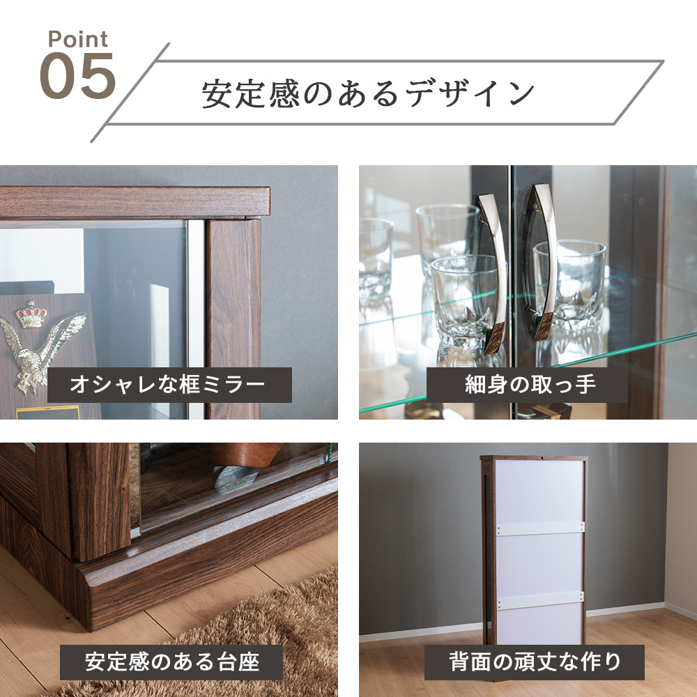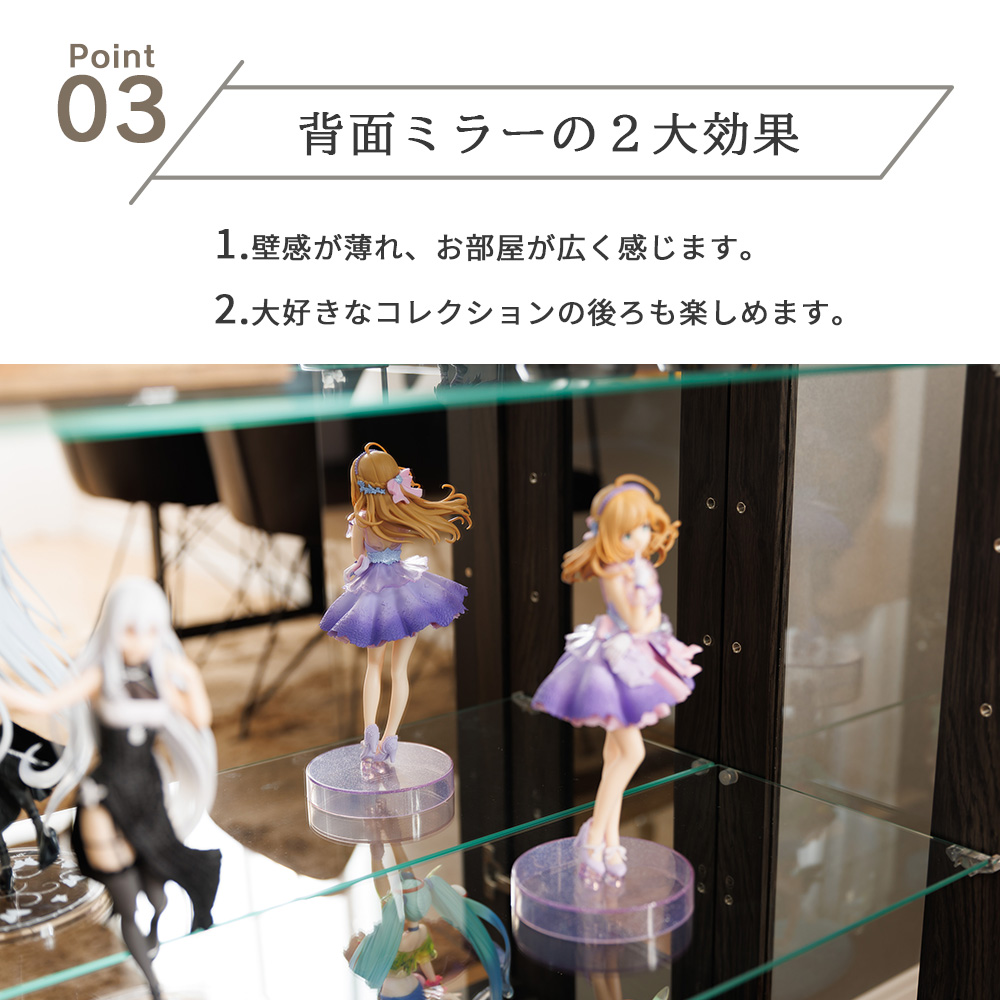 • 内側背面ミラー+戸カマチ(幅2cm)もミラー付きで、奥行き感が出てコレクションが立体的に映える
