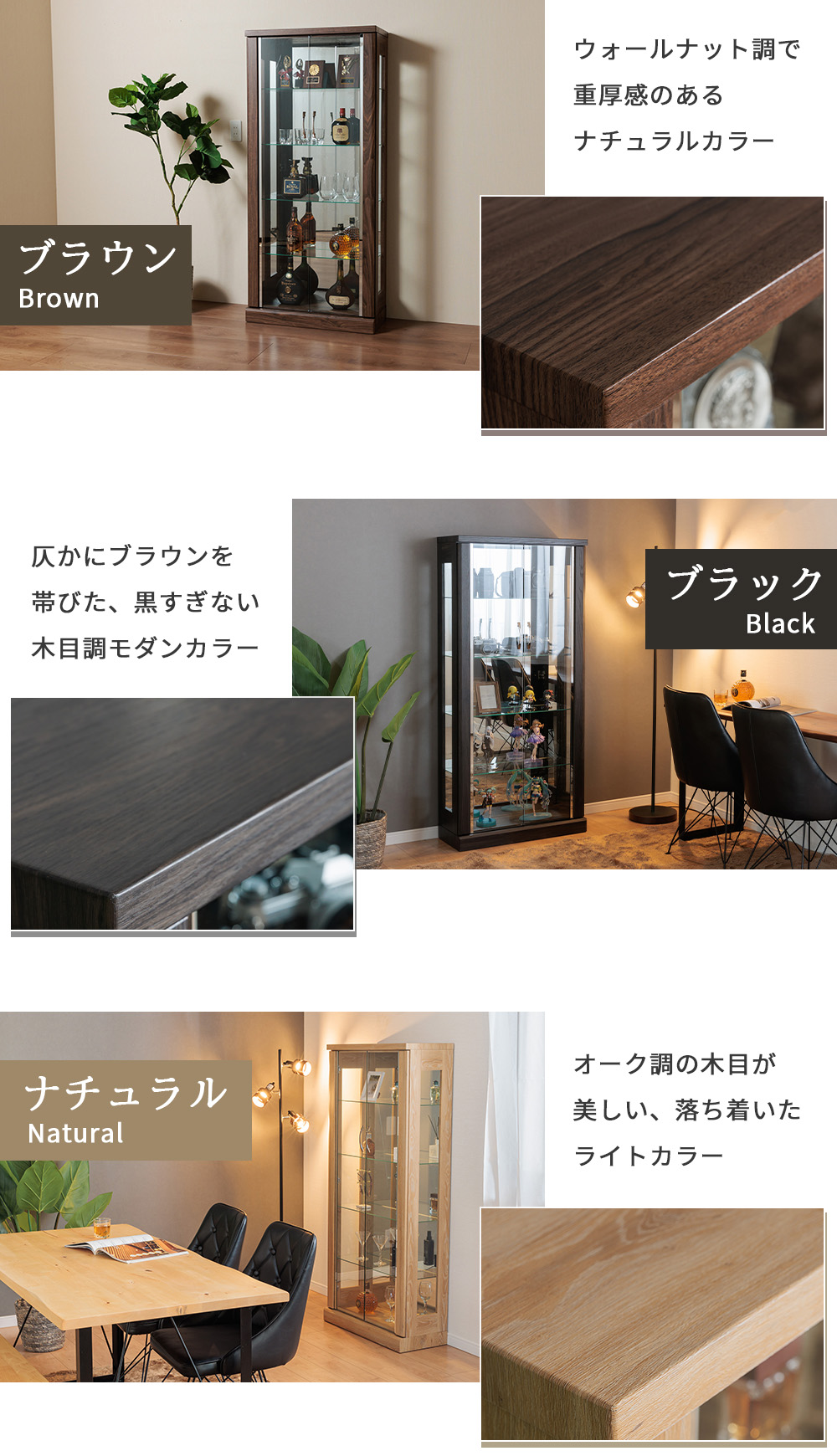 • 木目調(GAIAシリーズ)の落ち着いた見た目で、リビングに置いても“家具として映える”ショーケースにまとまりやすい(ナチュラル/ブラウン/ブラック)