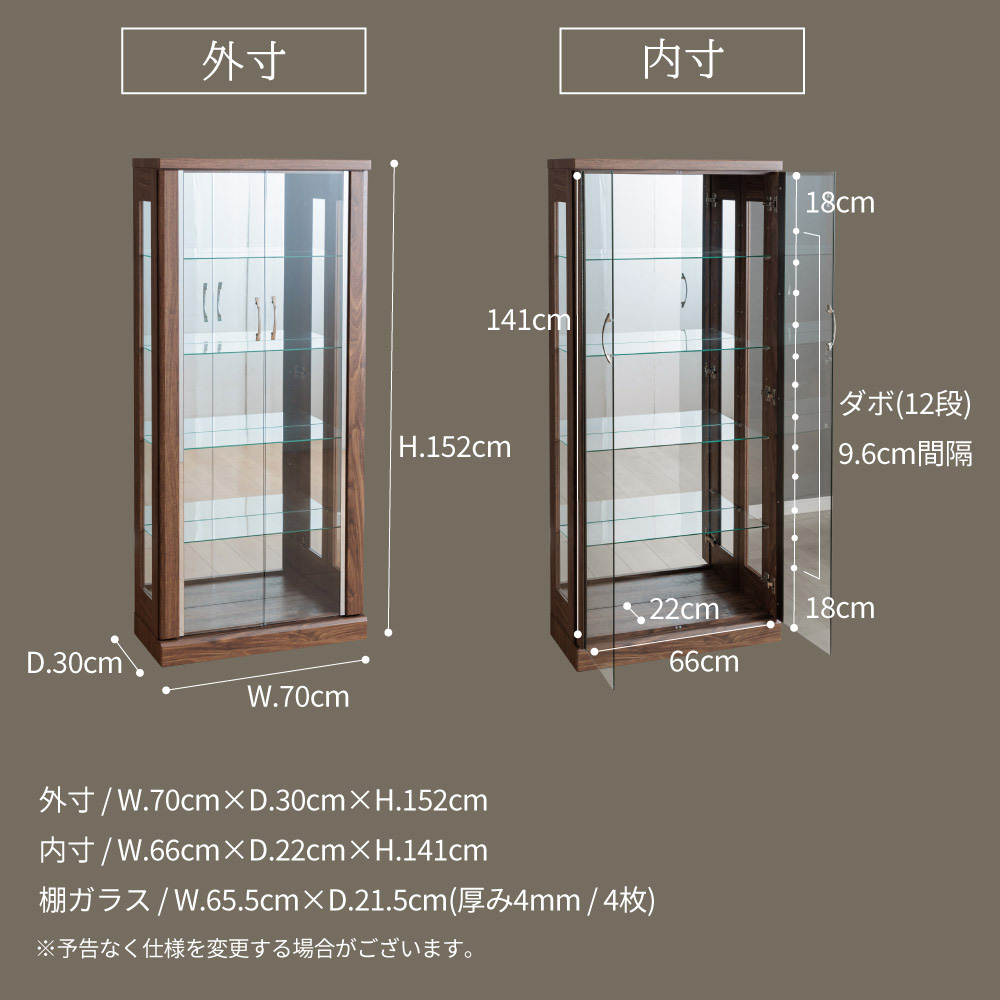 • 幅70×奥行30×高さ152cmのハイタイプで、床面積は抑えつつ“縦にたっぷり”飾れる大型サイズ