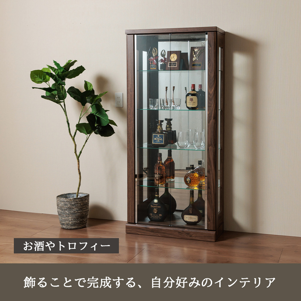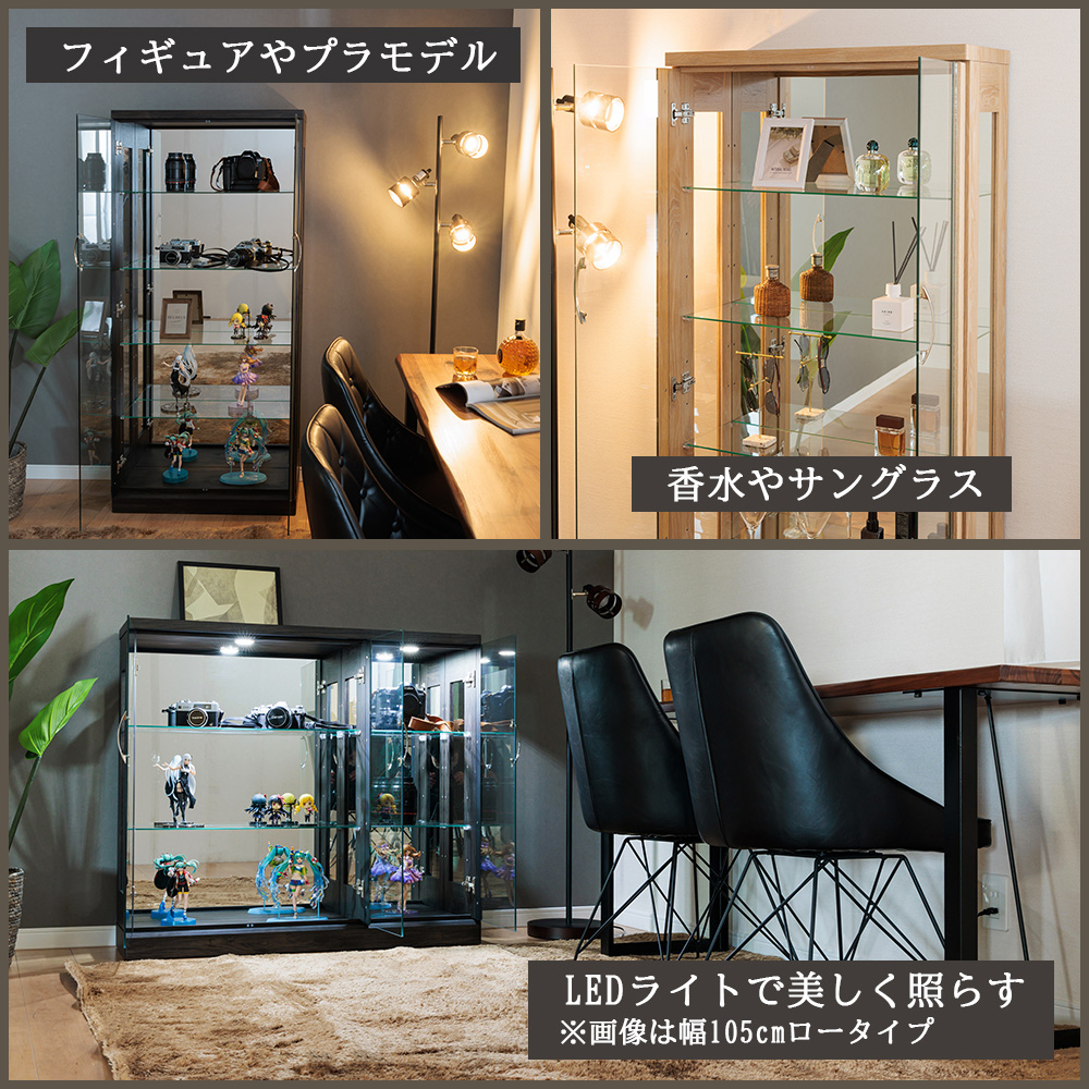• オプションでLEDダウンライト(白色/暖色)を追加可能。ケース内が暗くなりにくく、フィギュアやボトル類の存在感をしっかり引き立てられる
