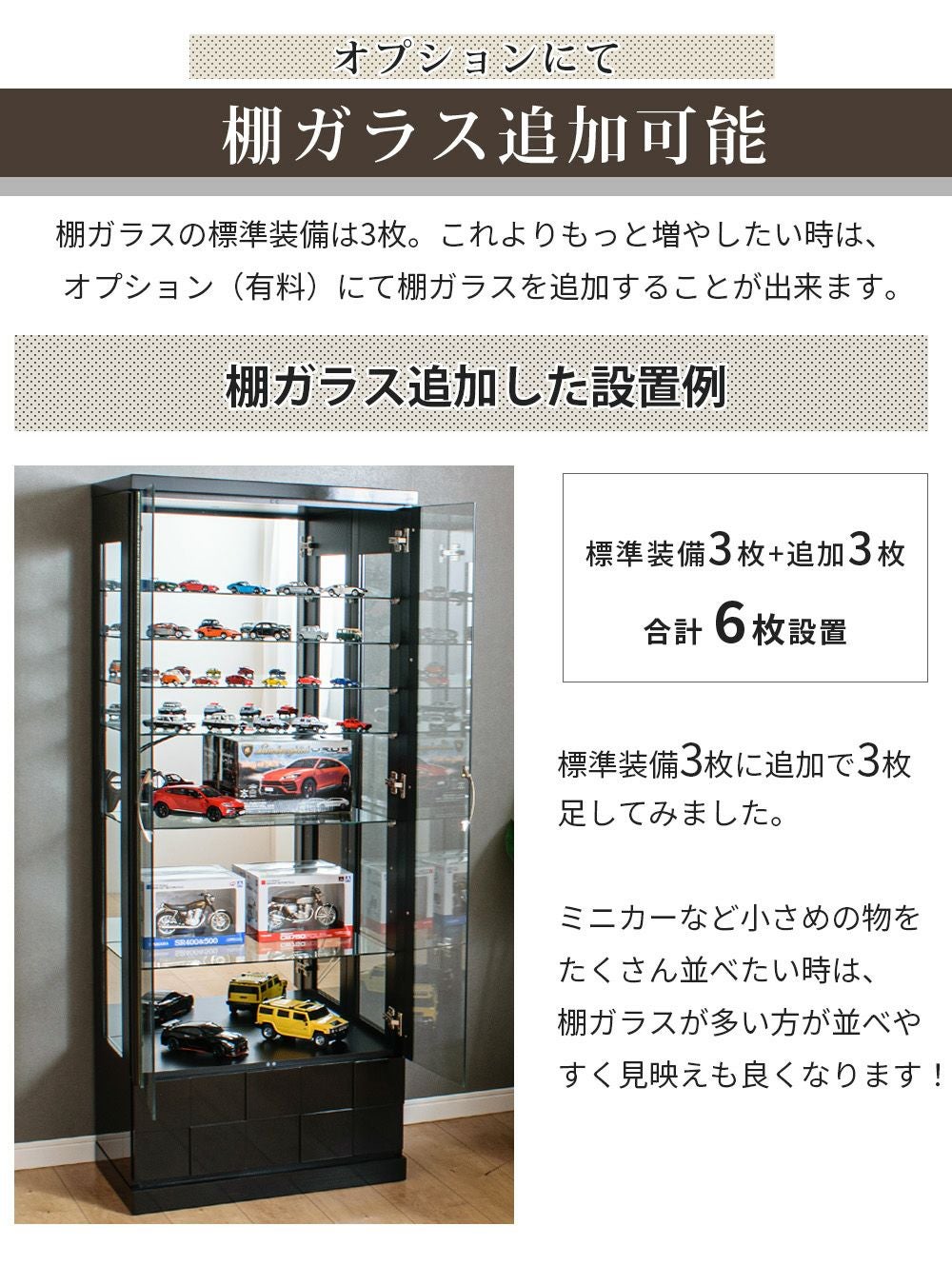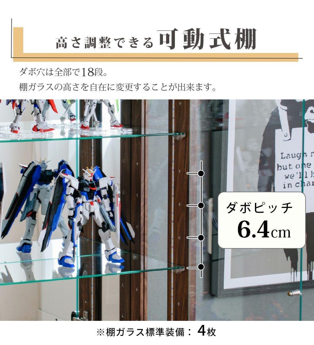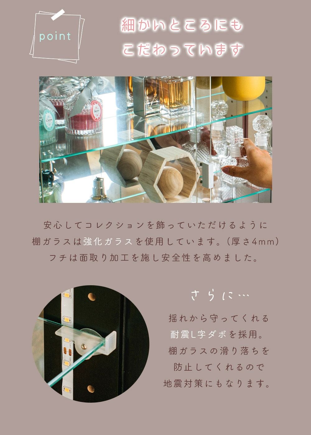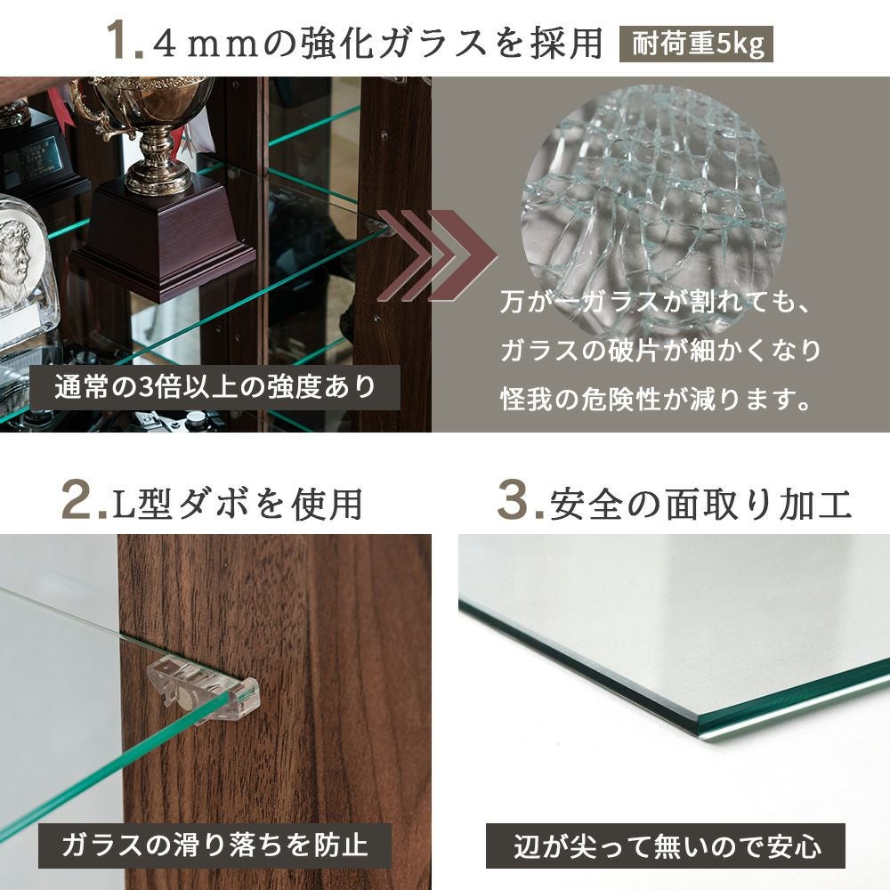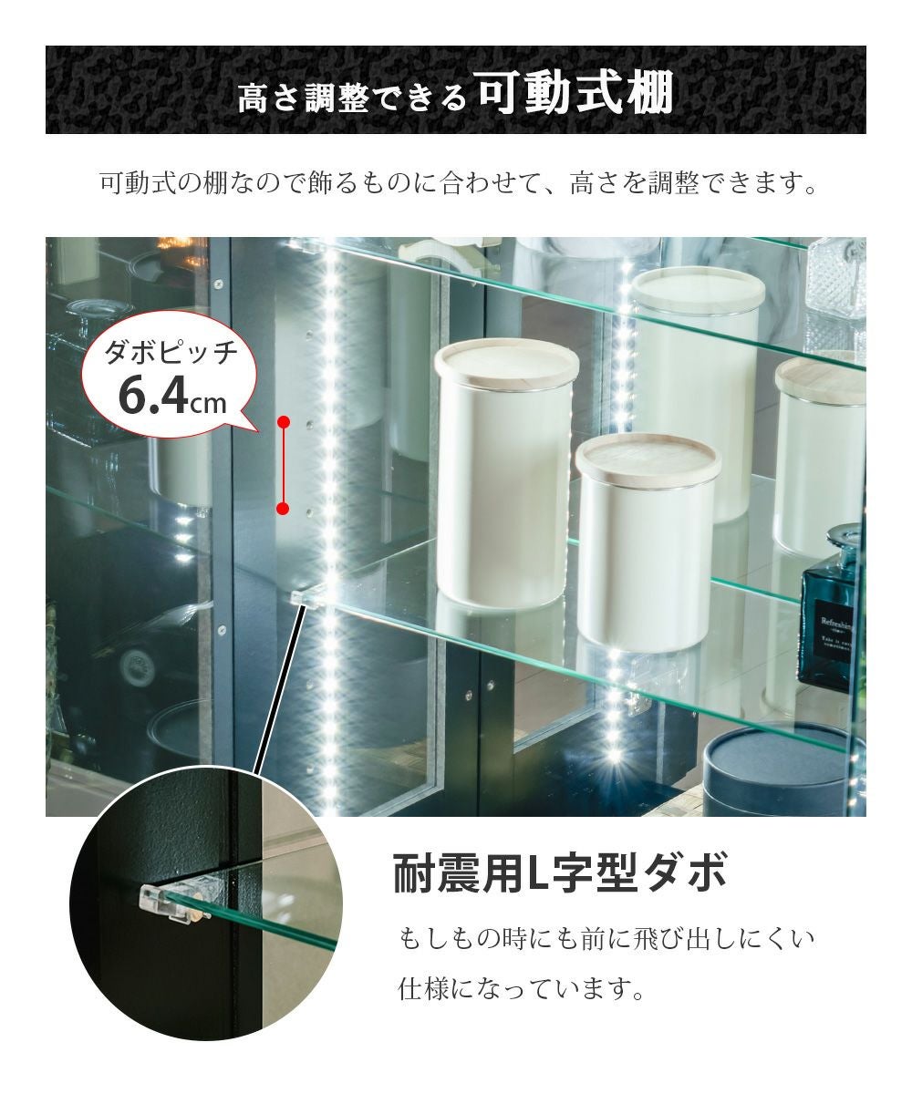 4.「安心して、たくさん飾れる」強化ガラス棚 × L型ダボ仕様