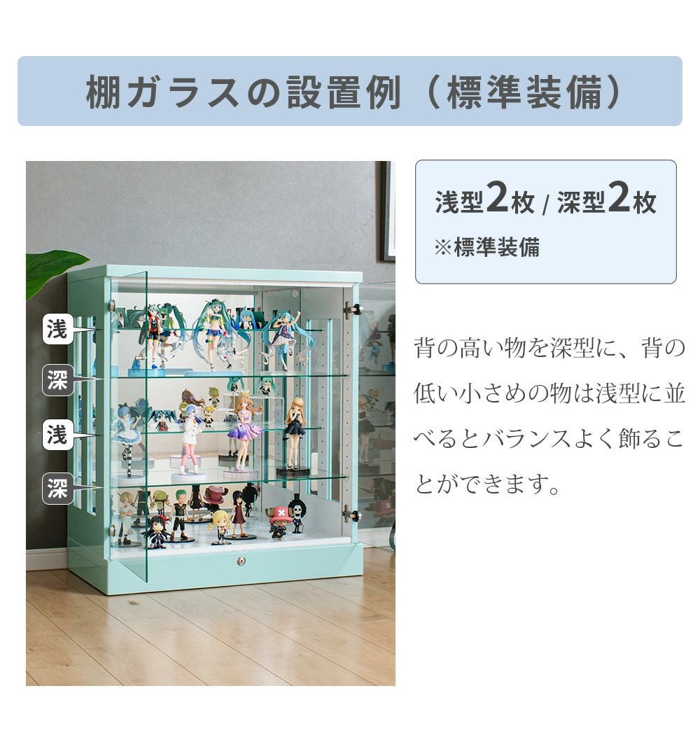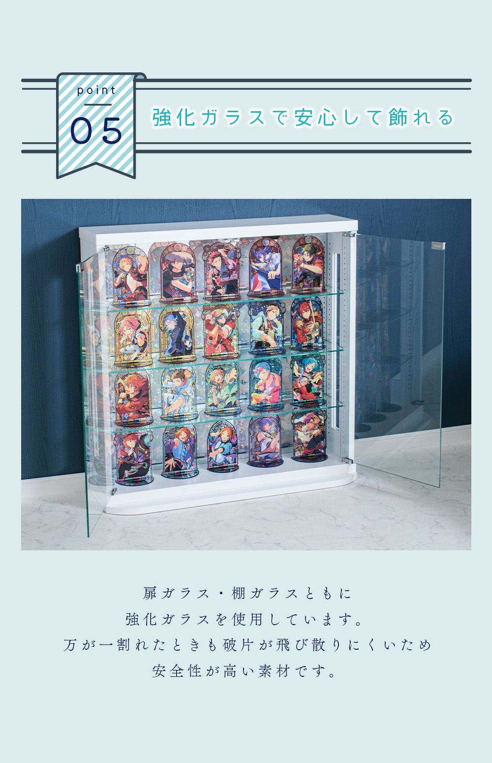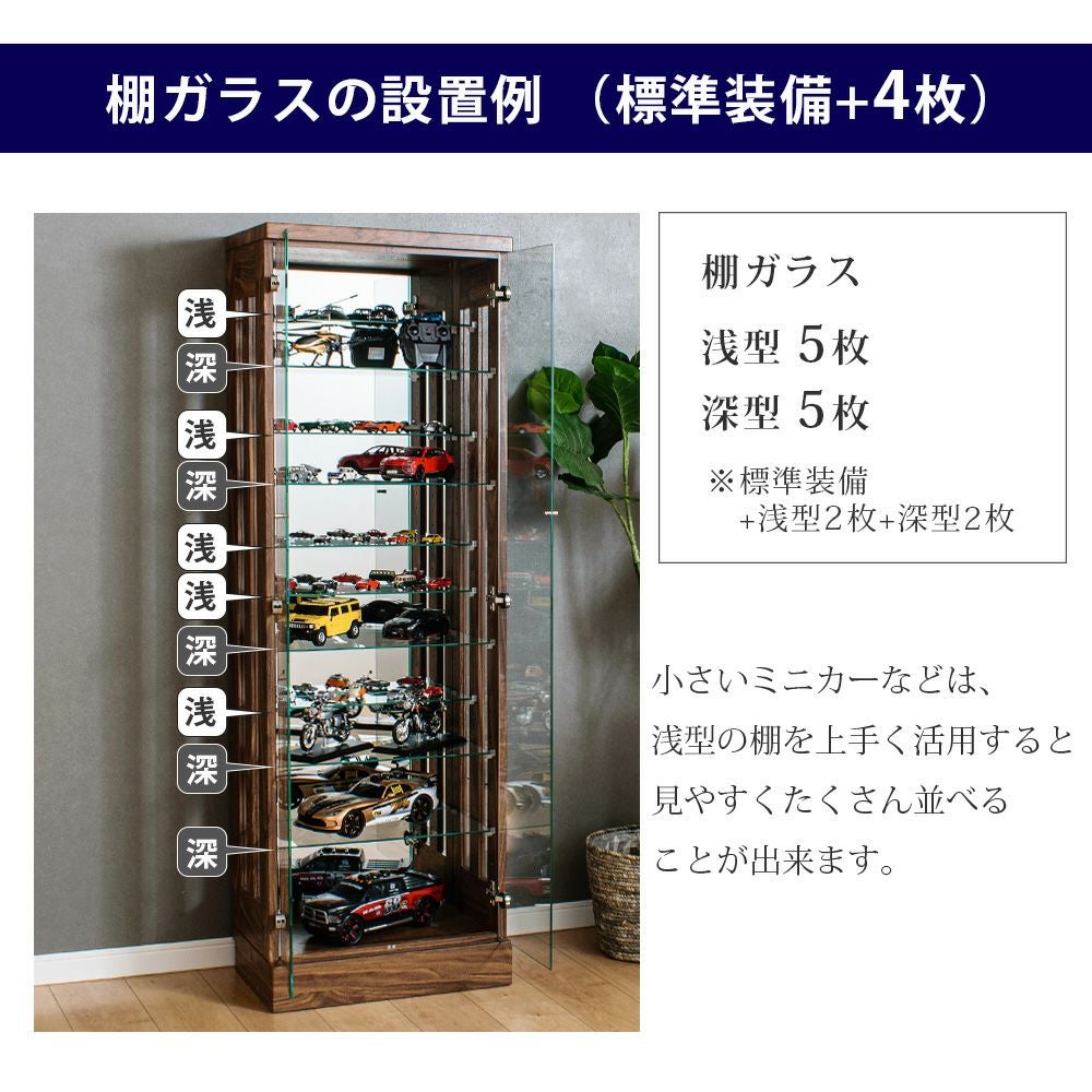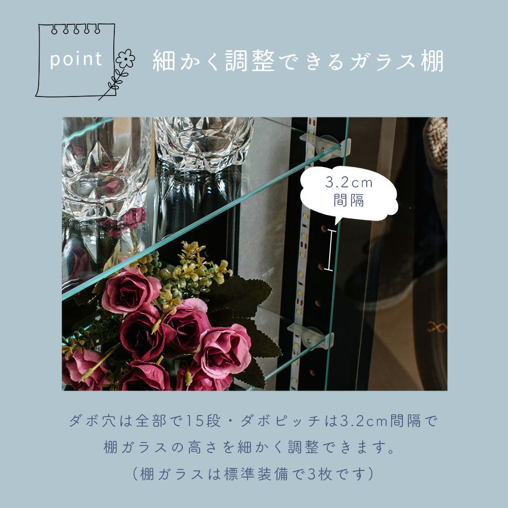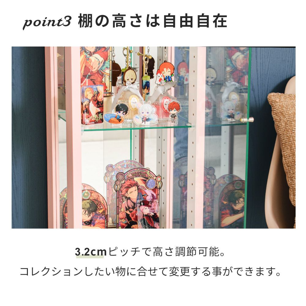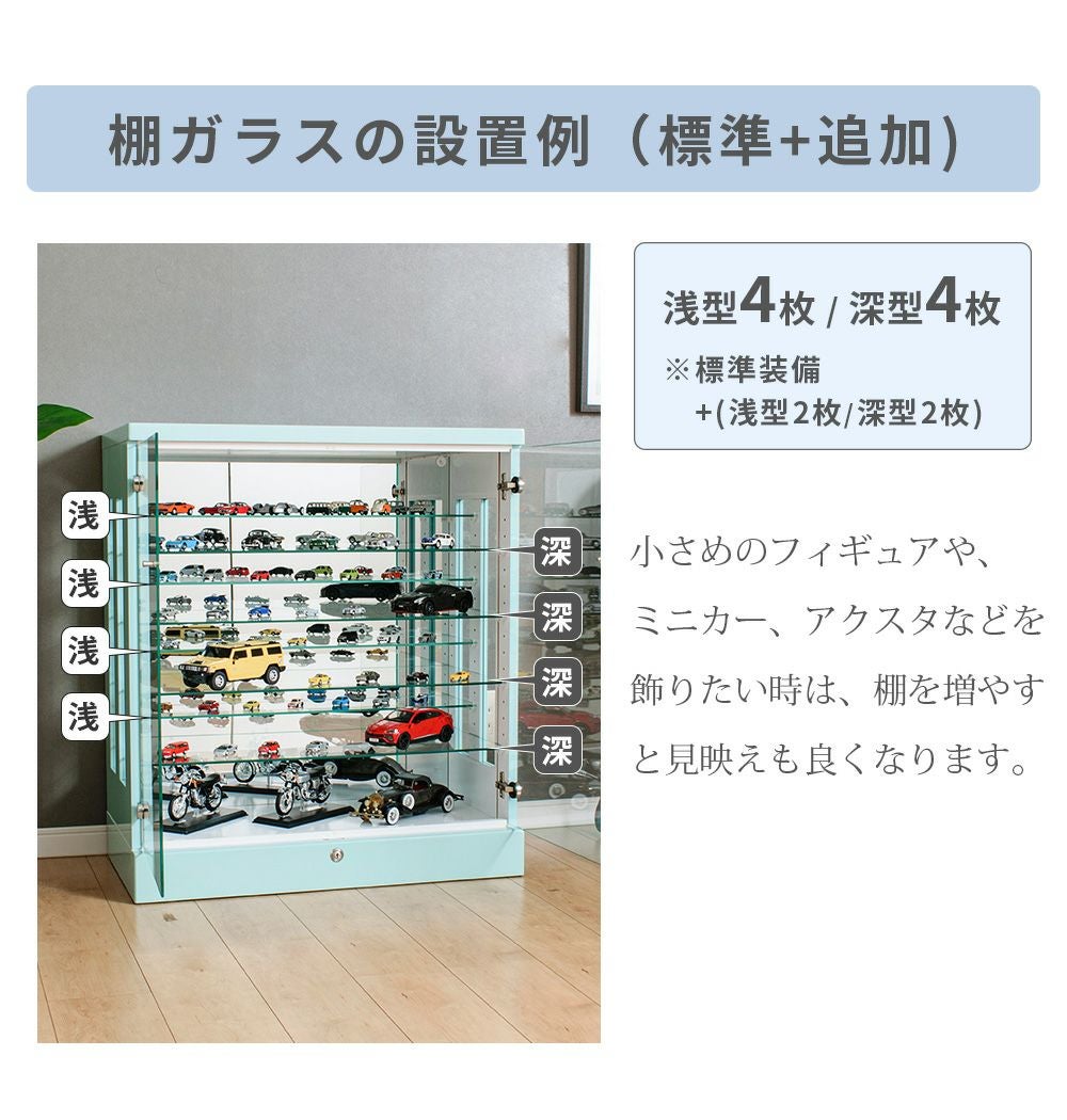 4.「安心して、たくさん飾れる」強化ガラス棚 × L型ダボ仕様