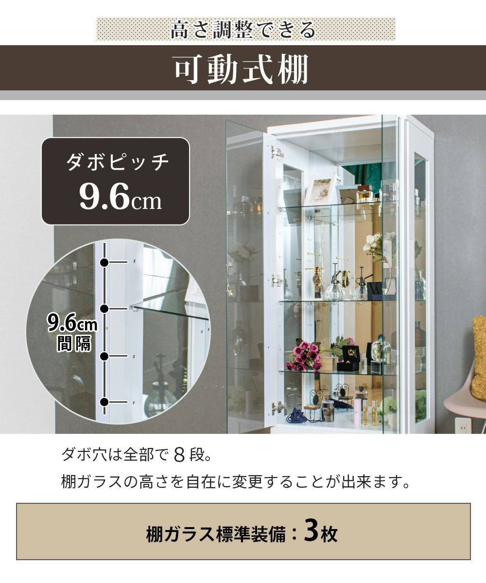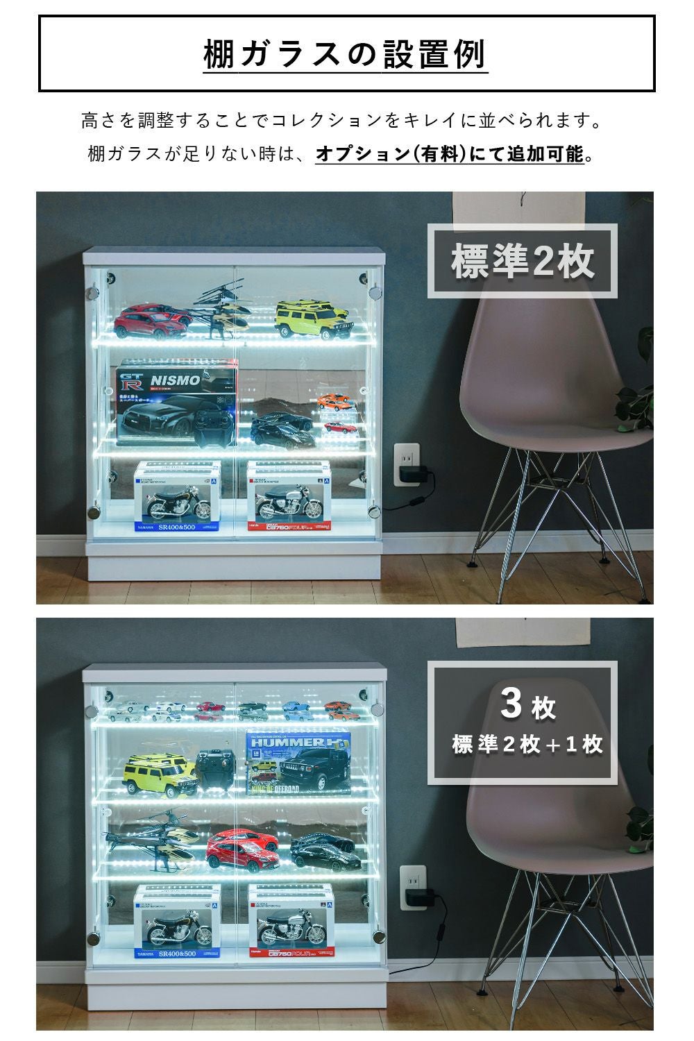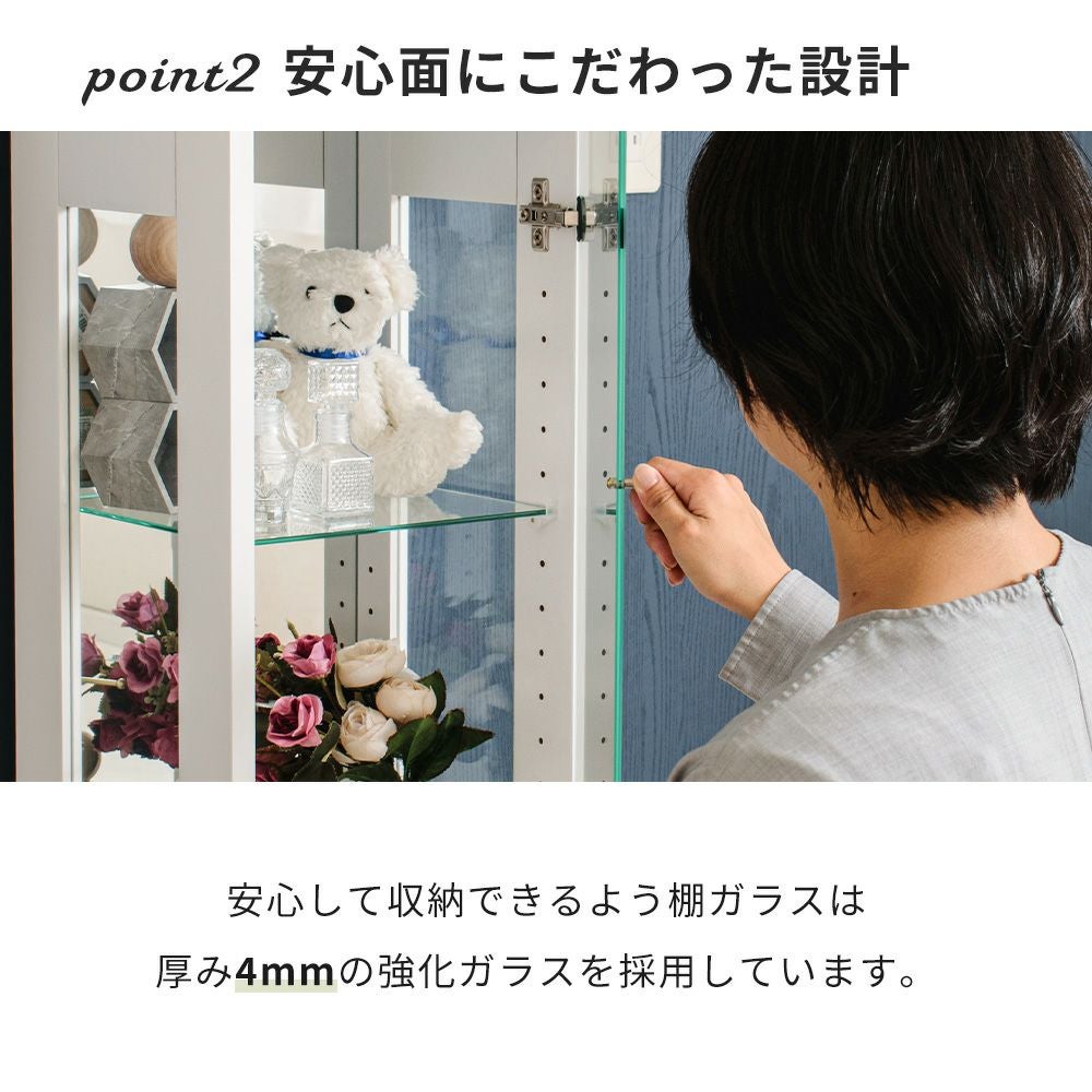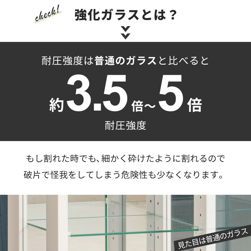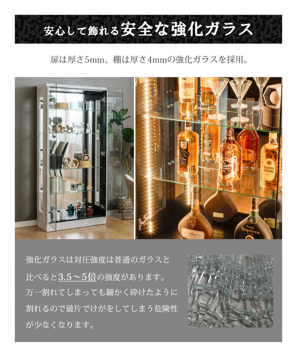4.「安心して、たくさん飾れる」強化ガラス棚 × L型ダボ仕様