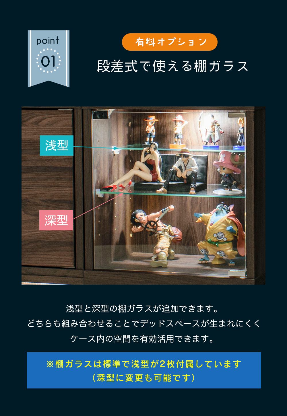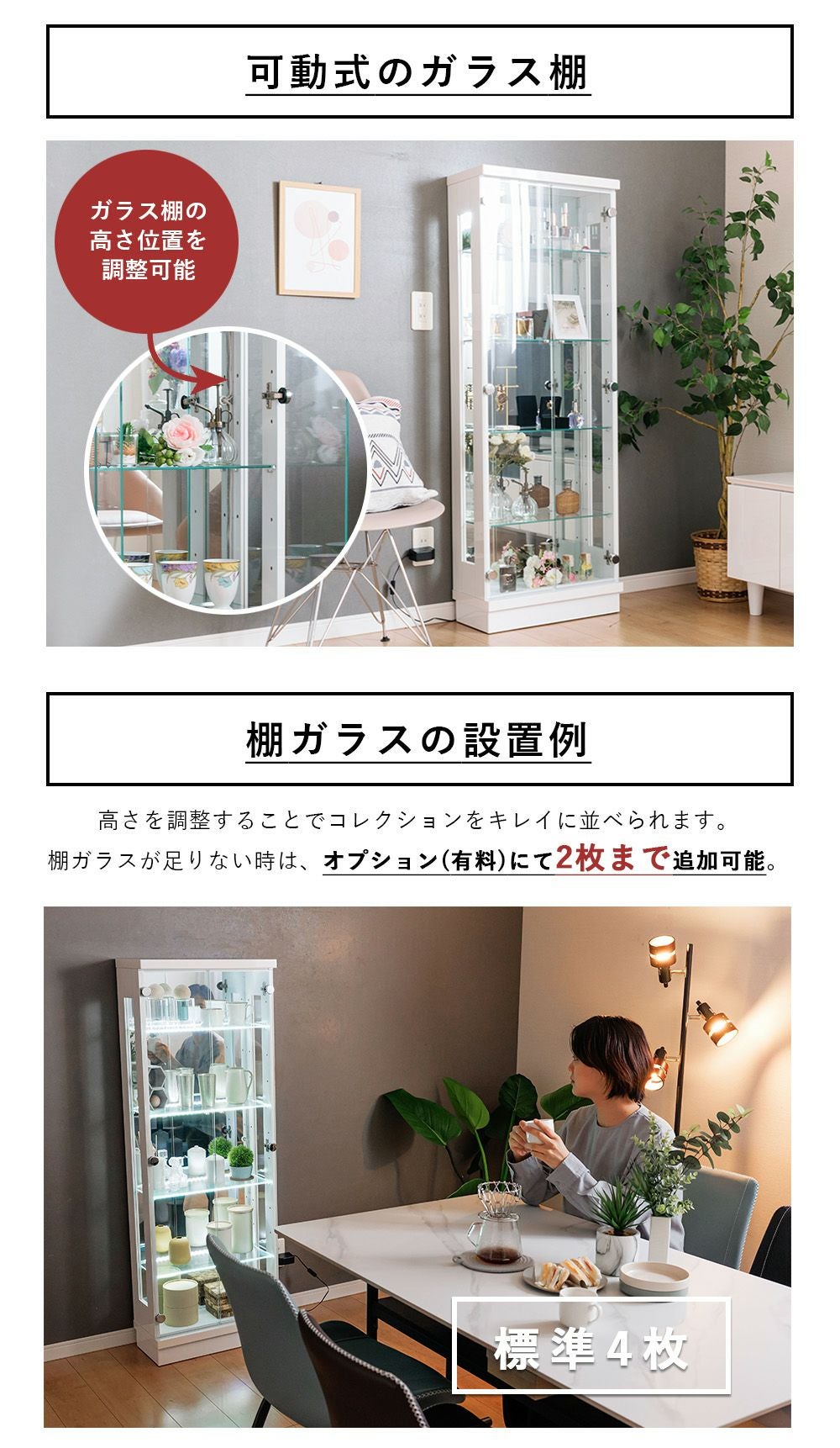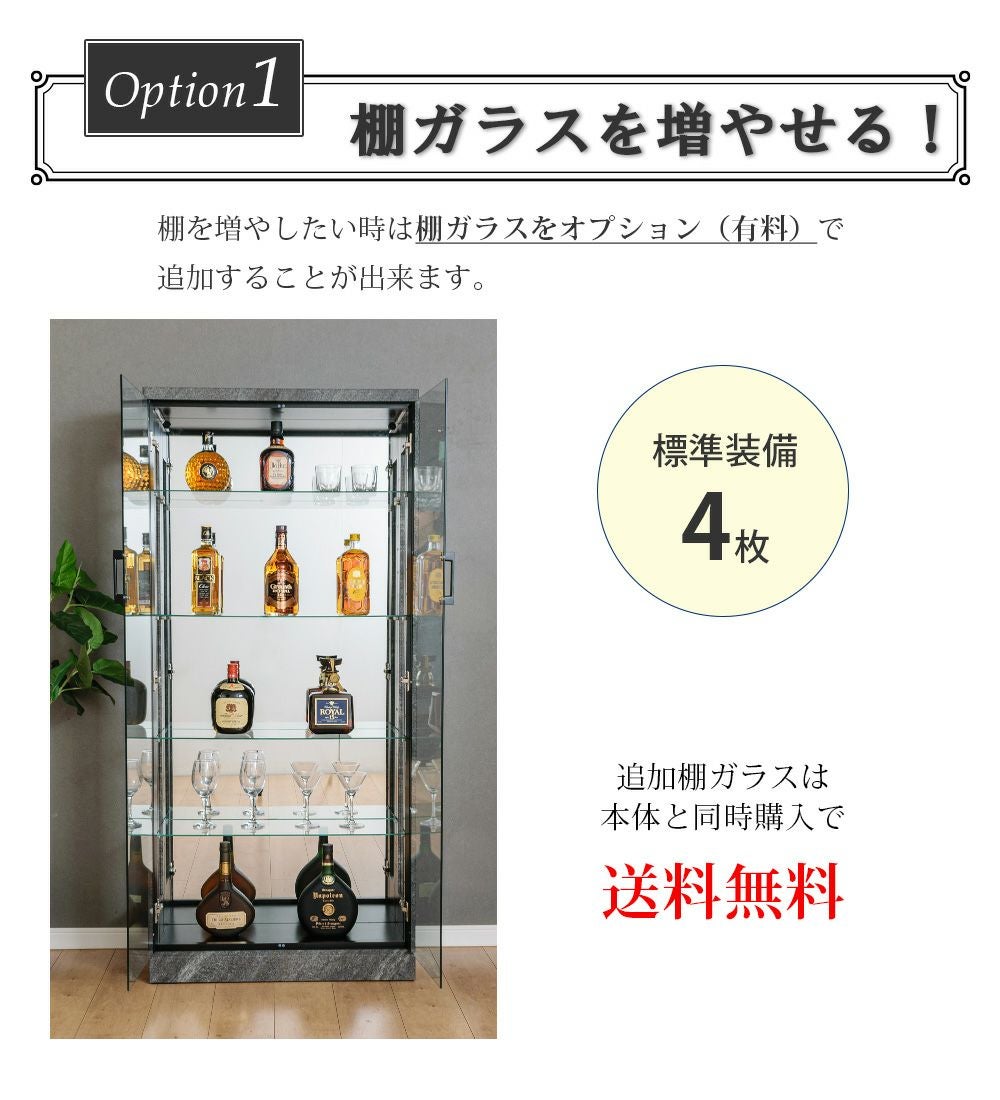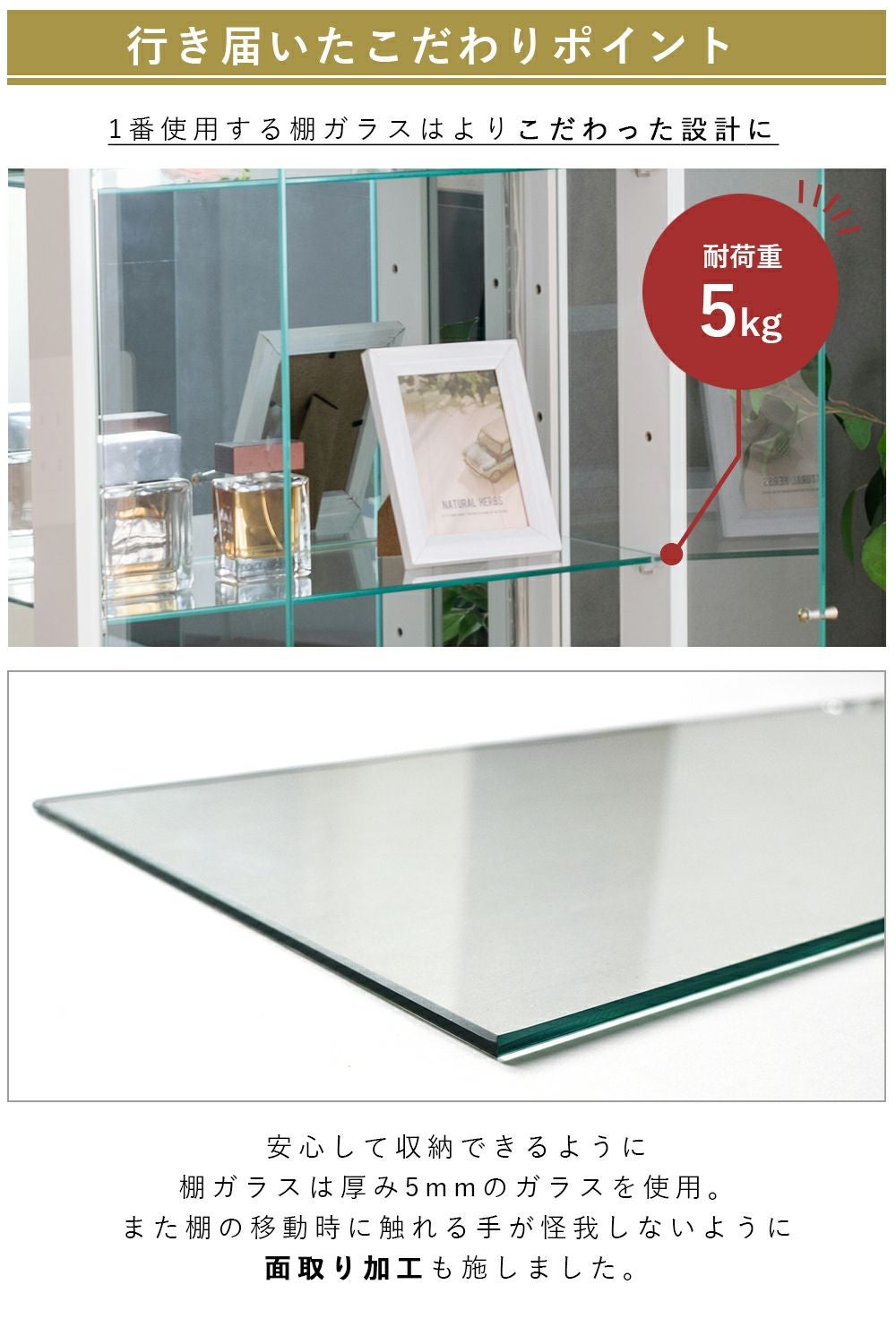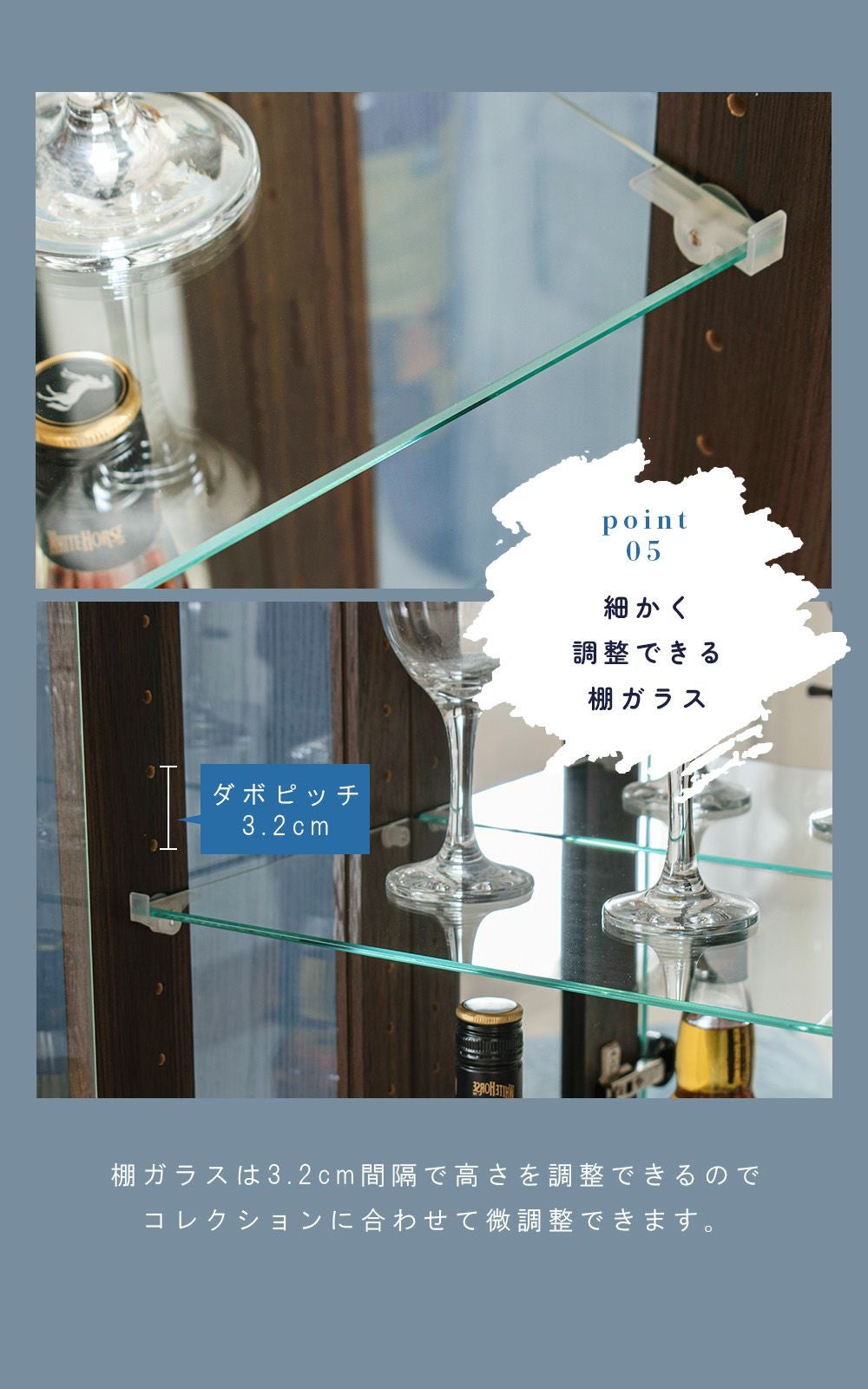 4.「安心して、たくさん飾れる」強化ガラス棚 × L型ダボ仕様