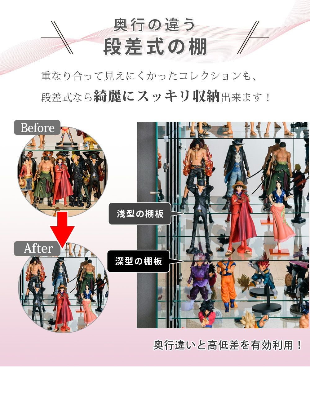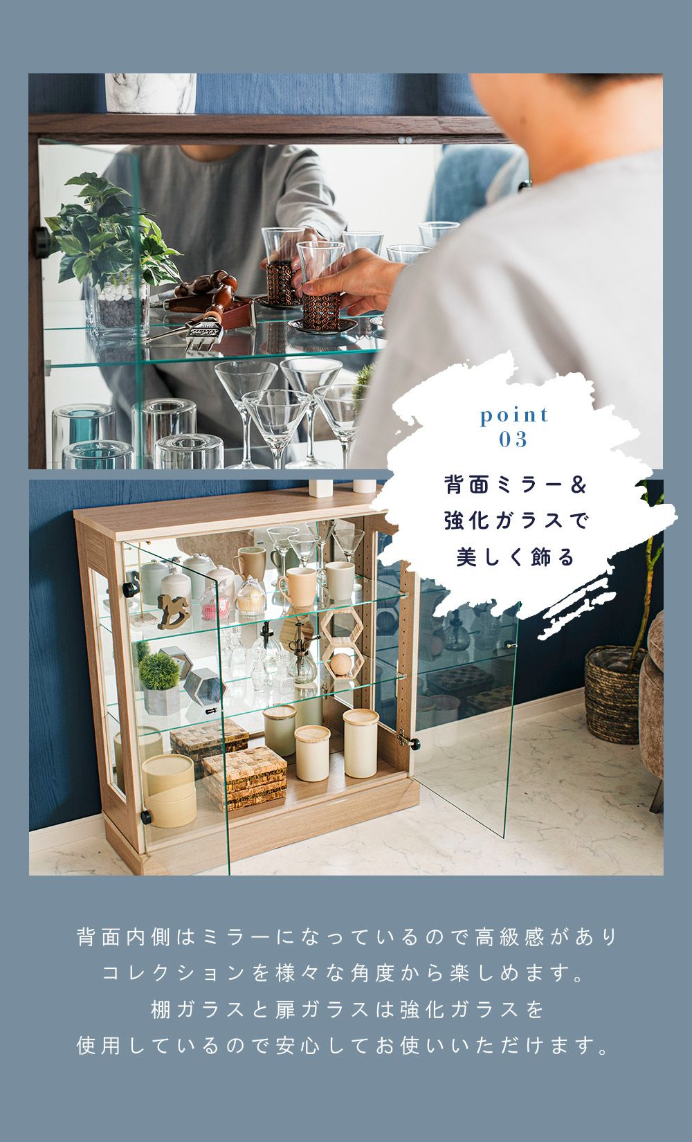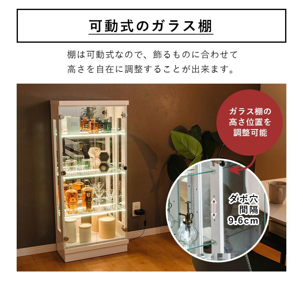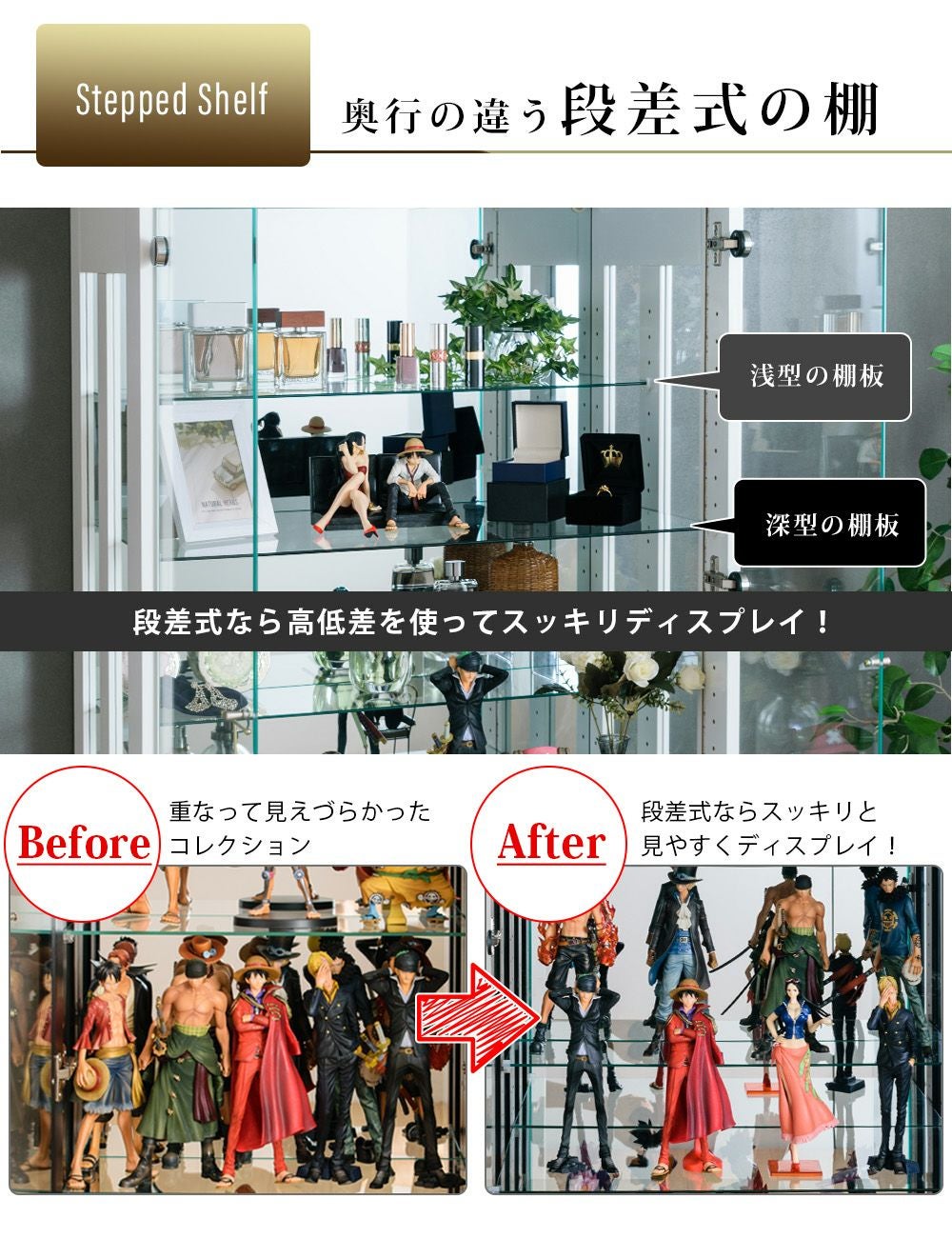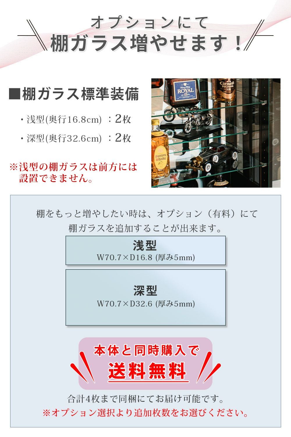 4.「安心して、たくさん飾れる」強化ガラス棚 × L型ダボ仕様