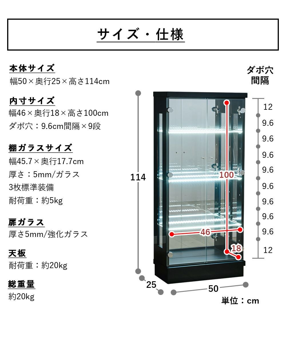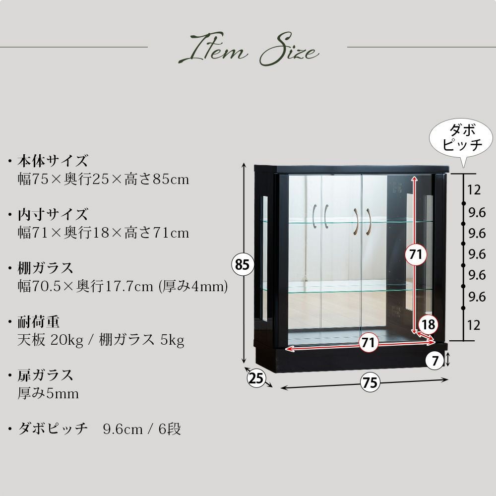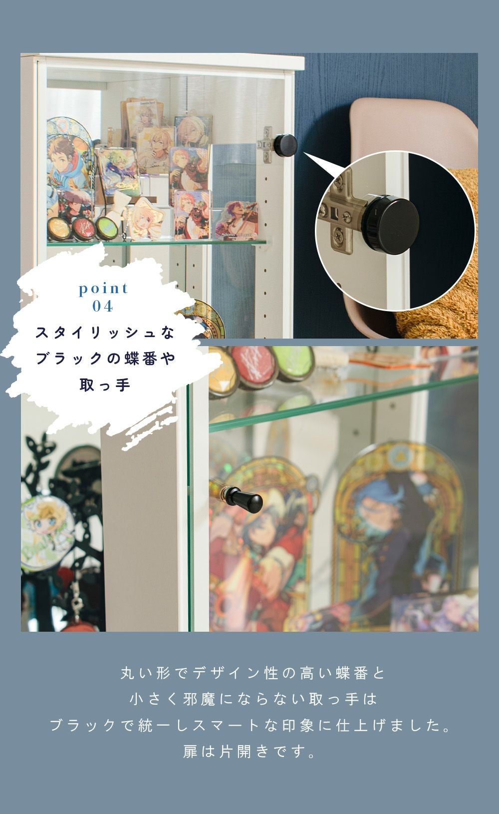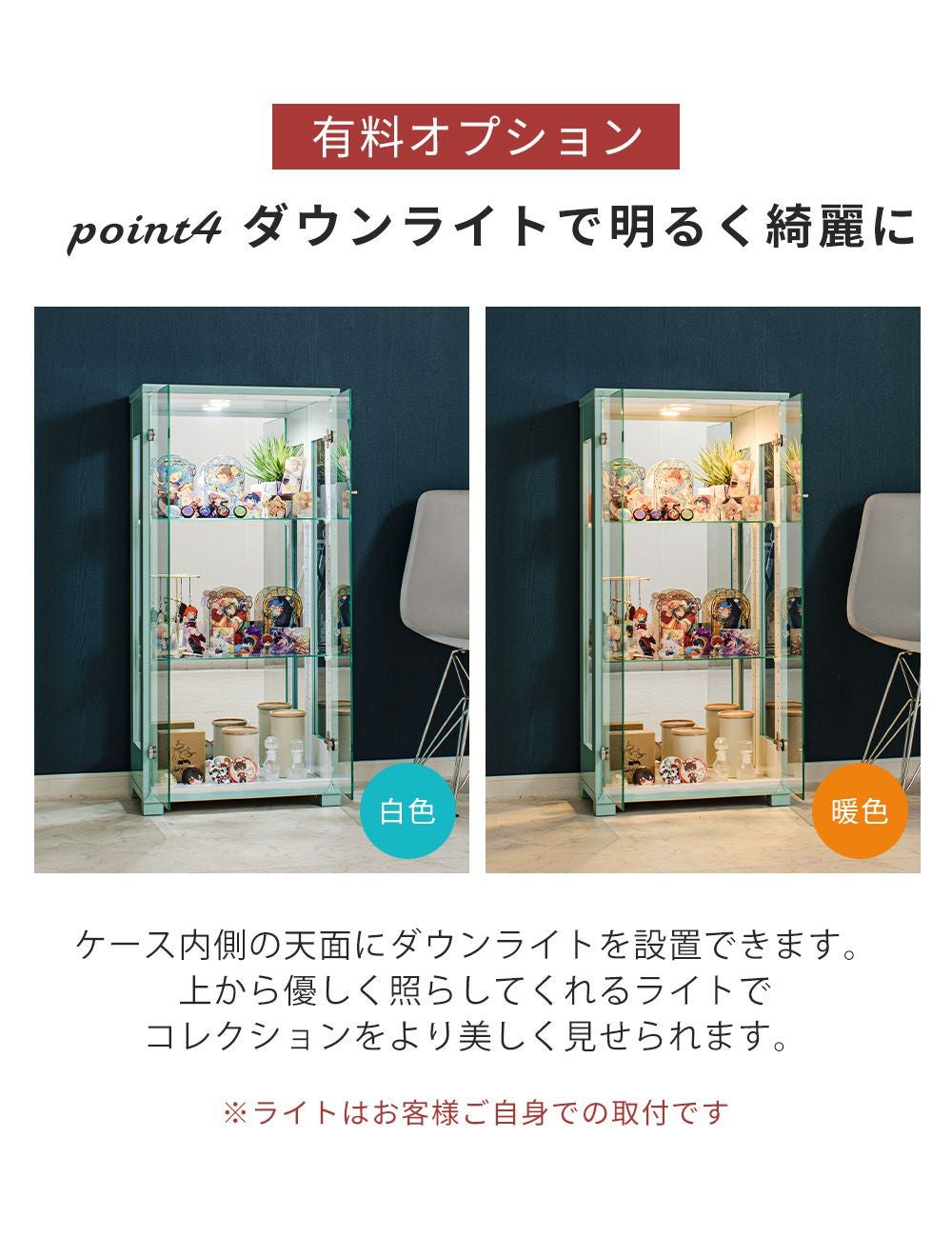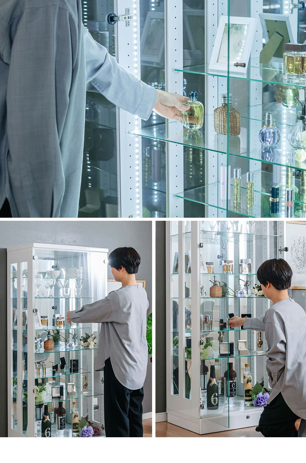4.「安心して、たくさん飾れる」強化ガラス棚 × L型ダボ仕様