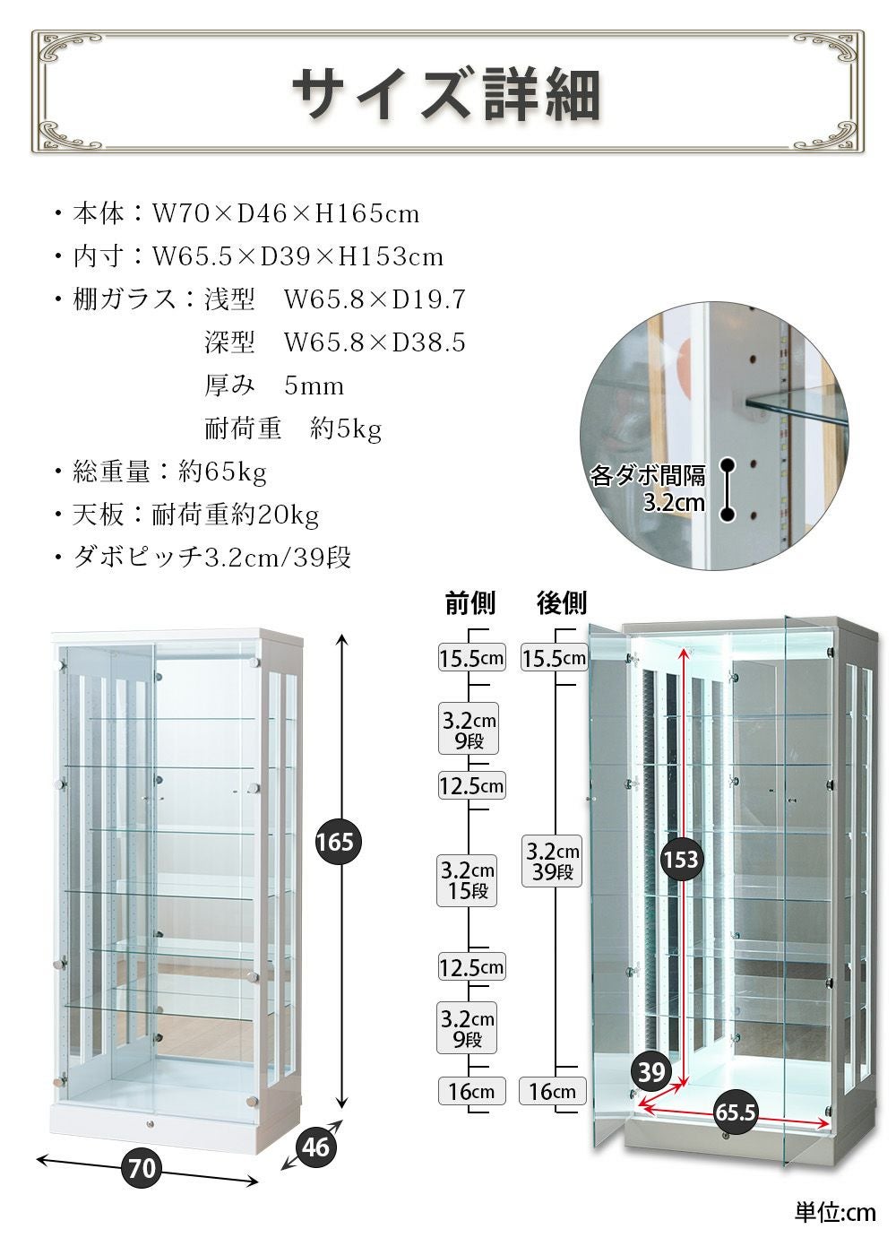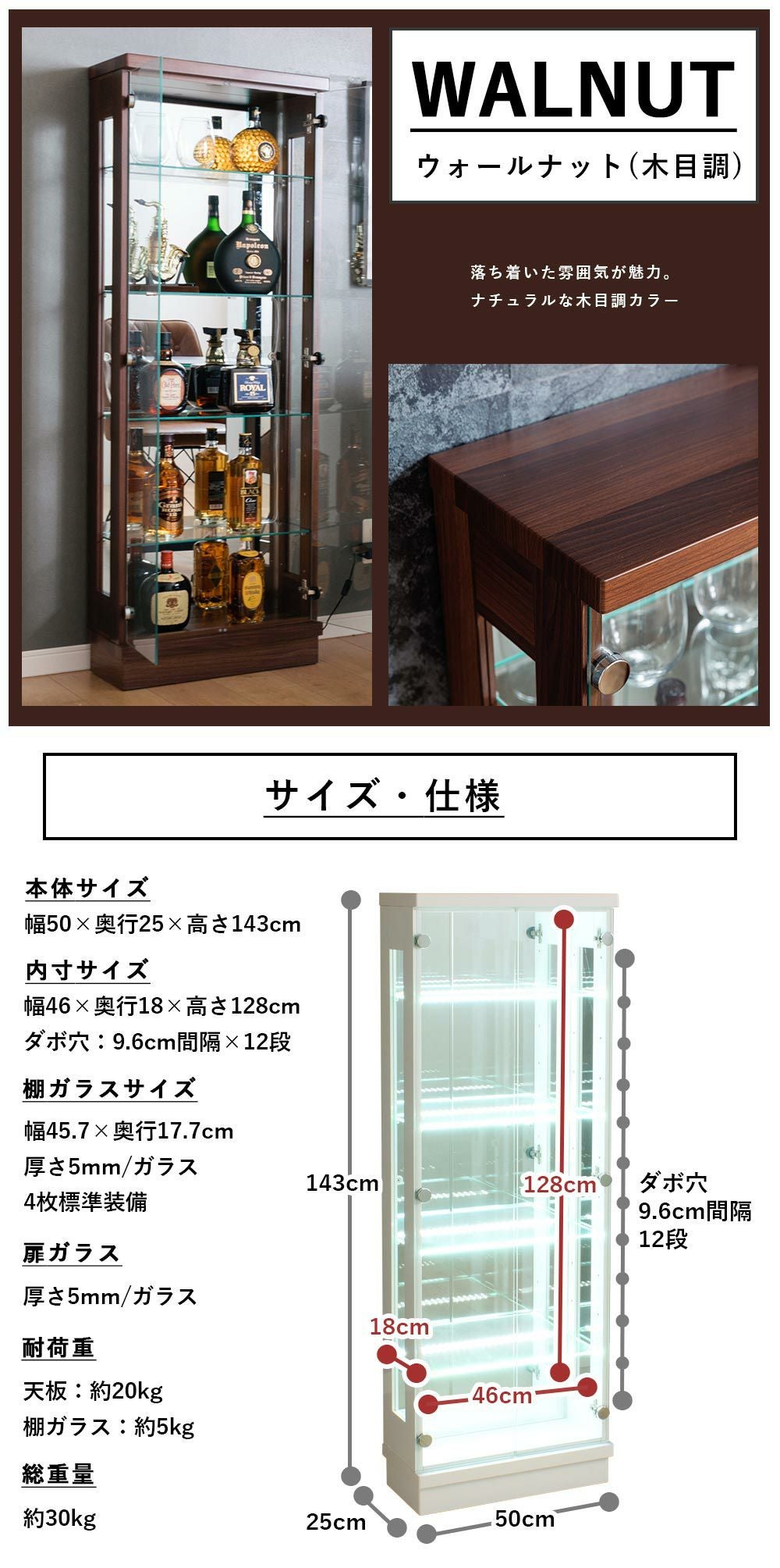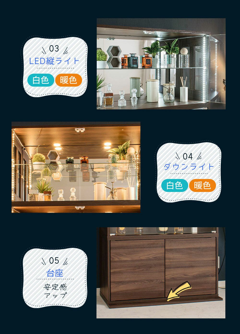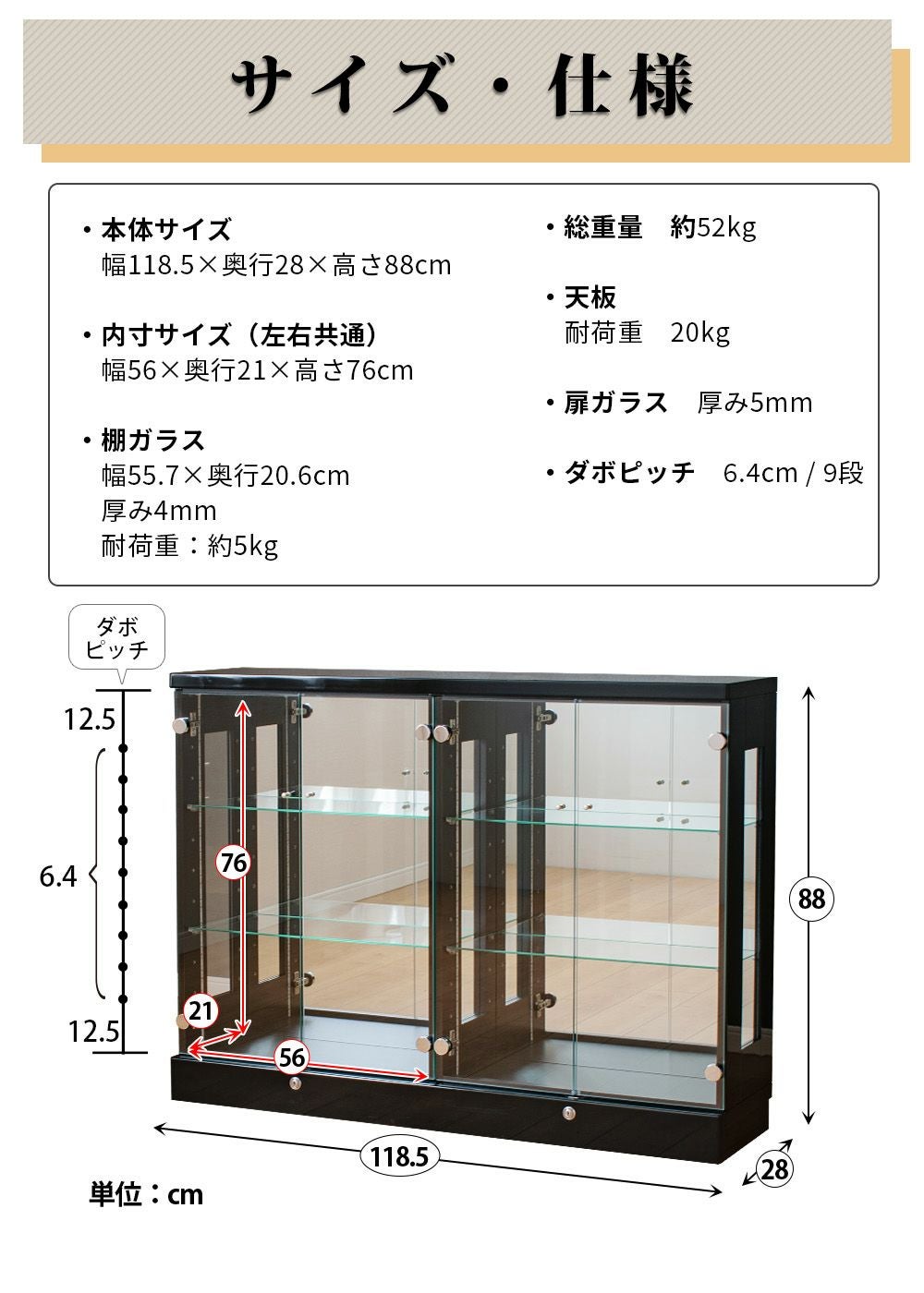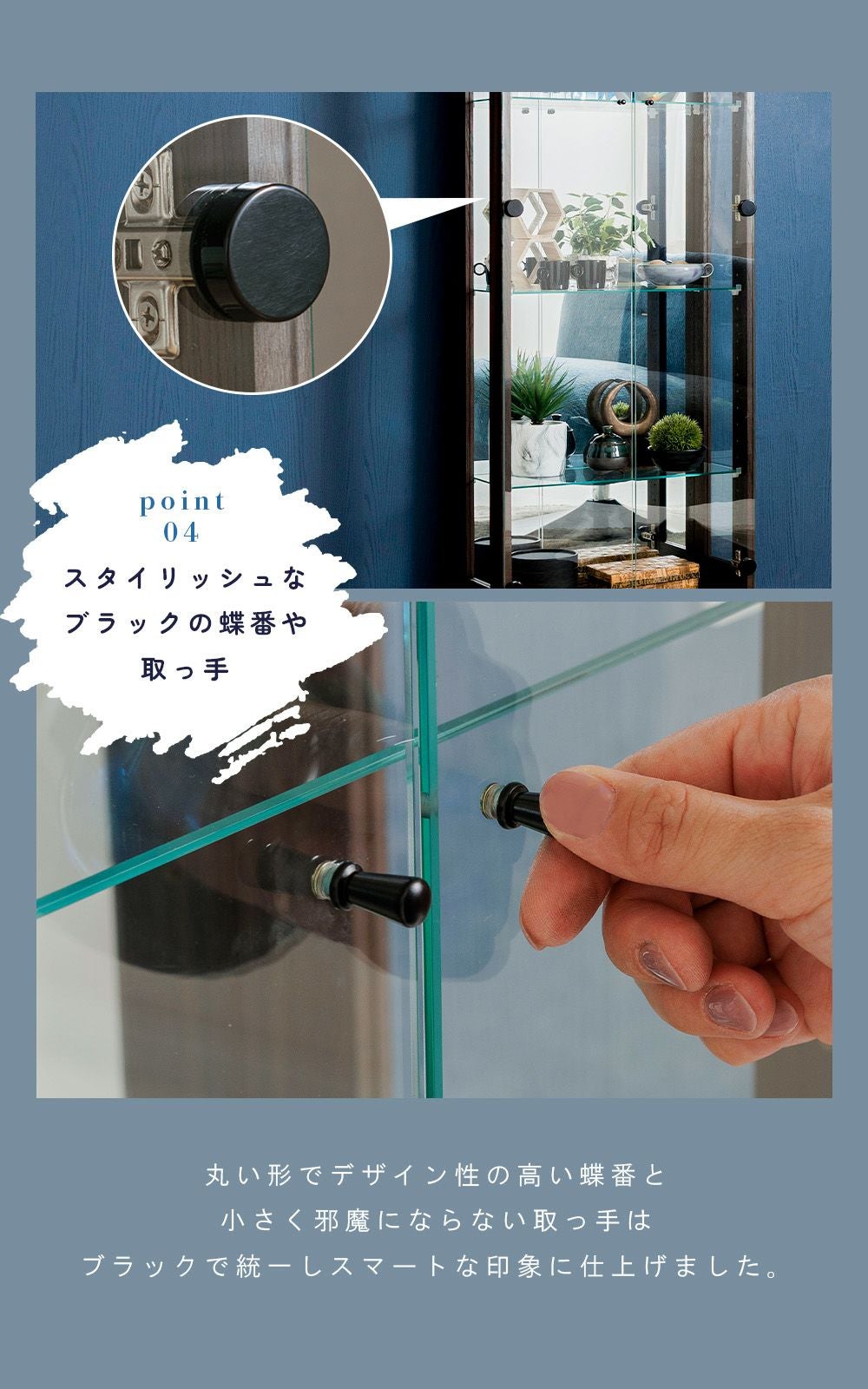 4.「安心して、たくさん飾れる」強化ガラス棚 × L型ダボ仕様