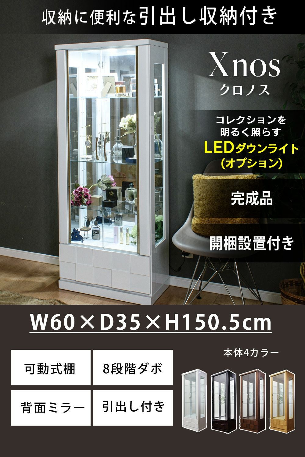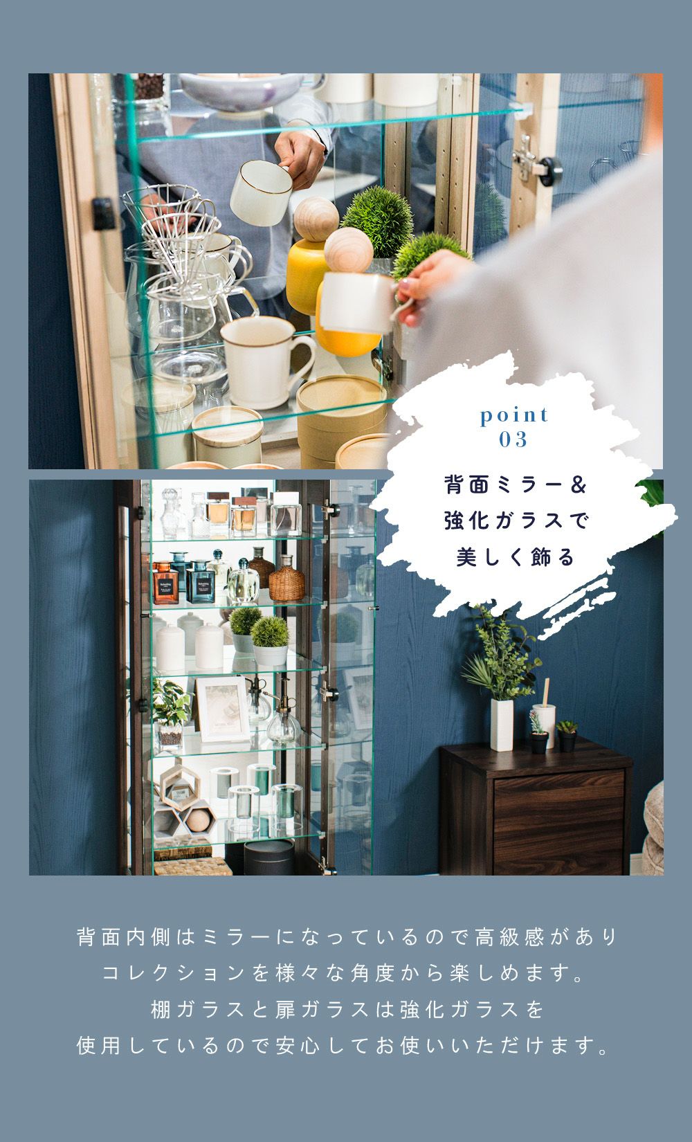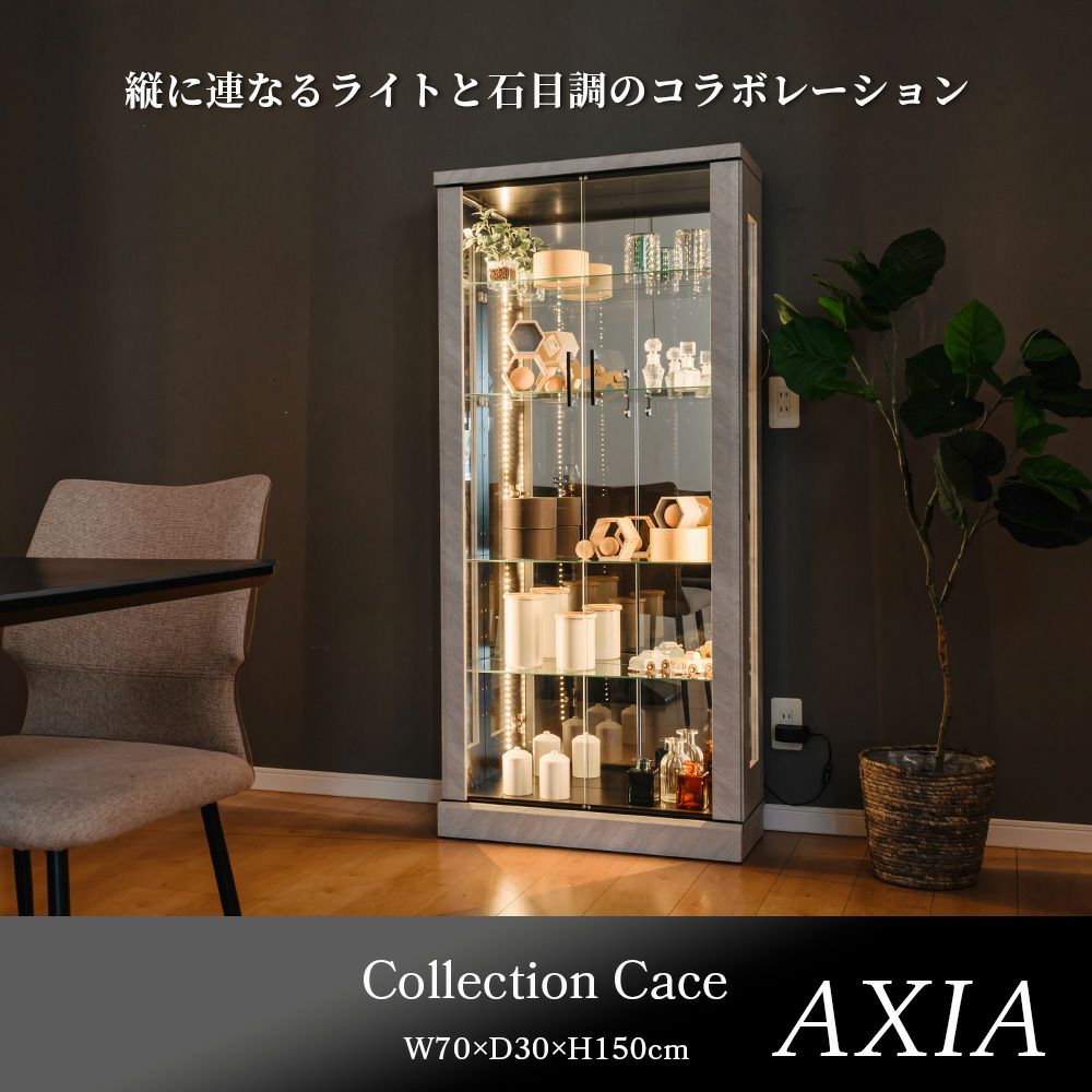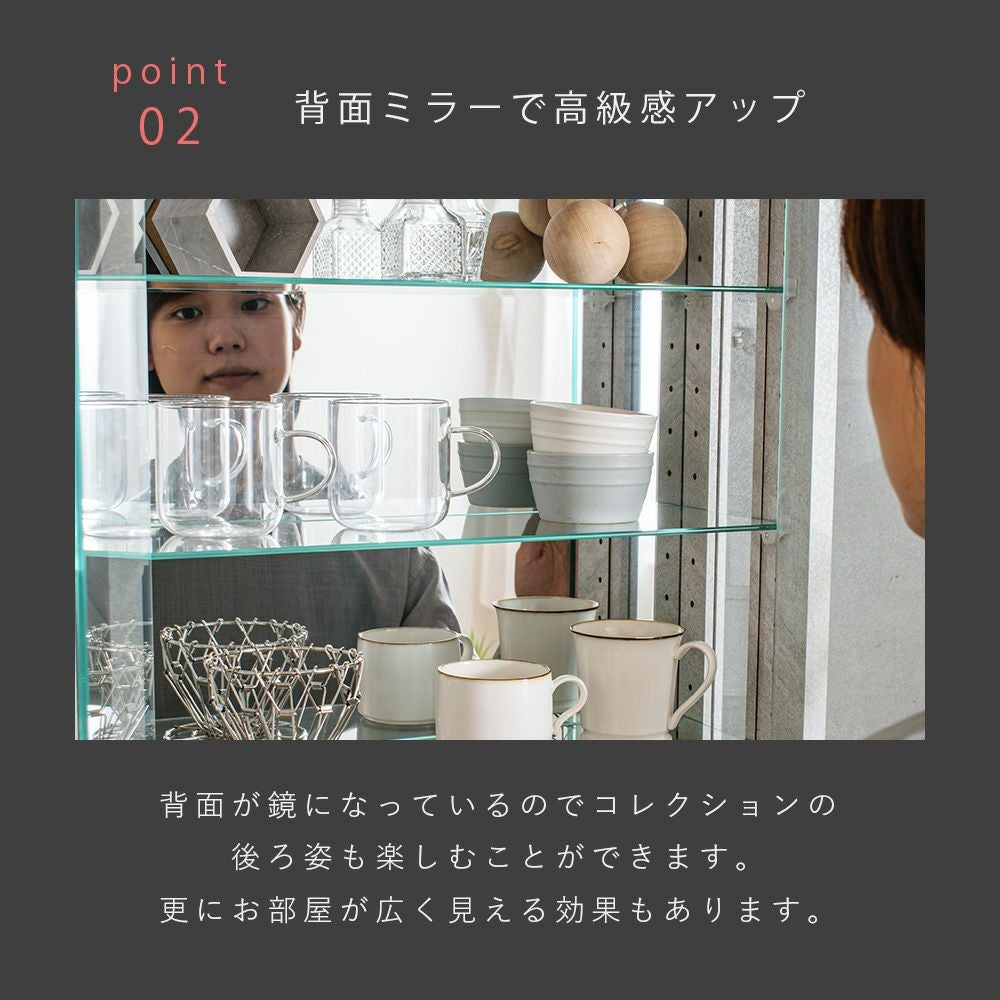 背面ミラー仕様により、コレクションを多方向から楽しめるディスプレイ空間を実現。