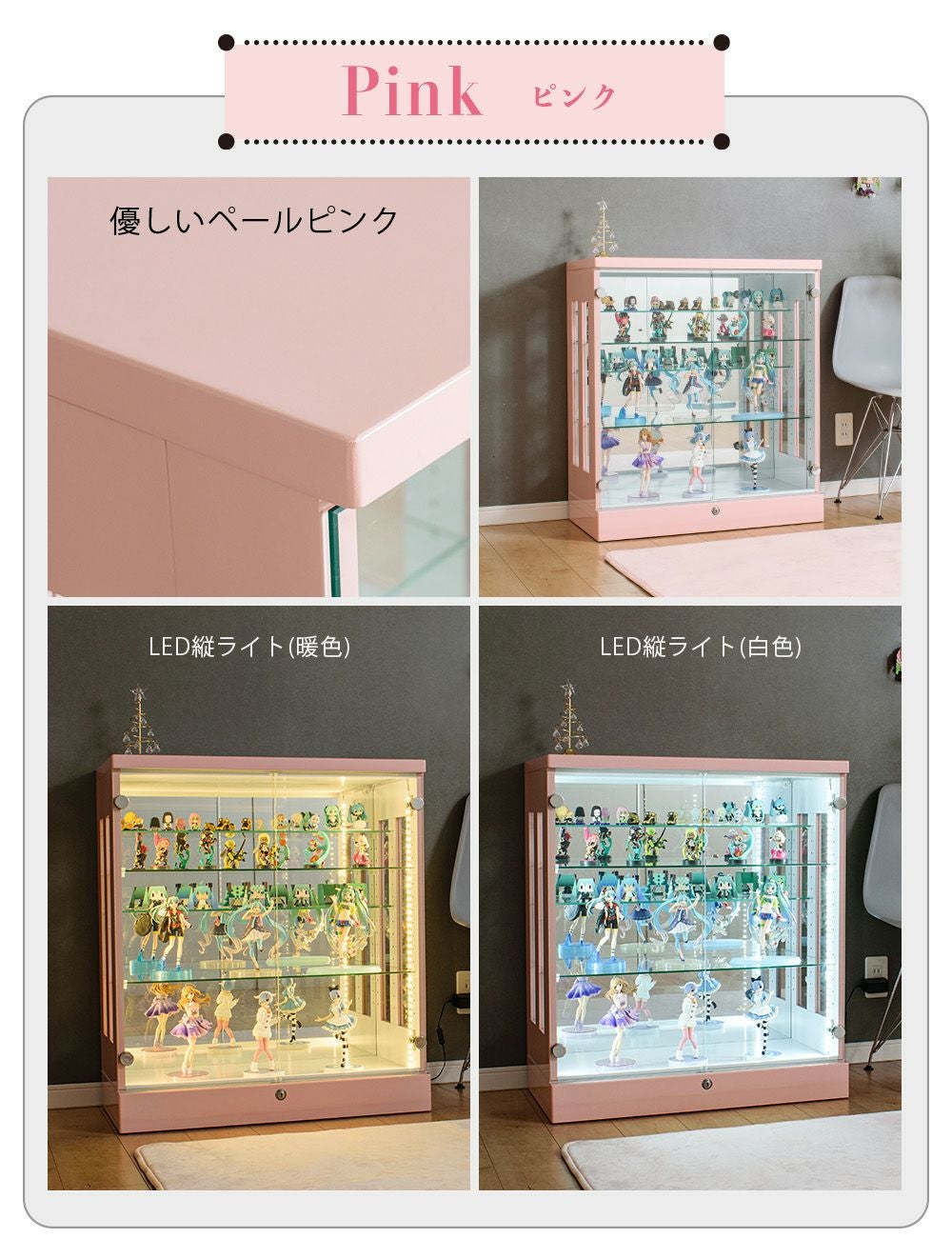 さらに、LEDライト取り付け対応モデルや背面ミラー付きモデルもあり、推しを“飾る”から“魅せる”展示へ。