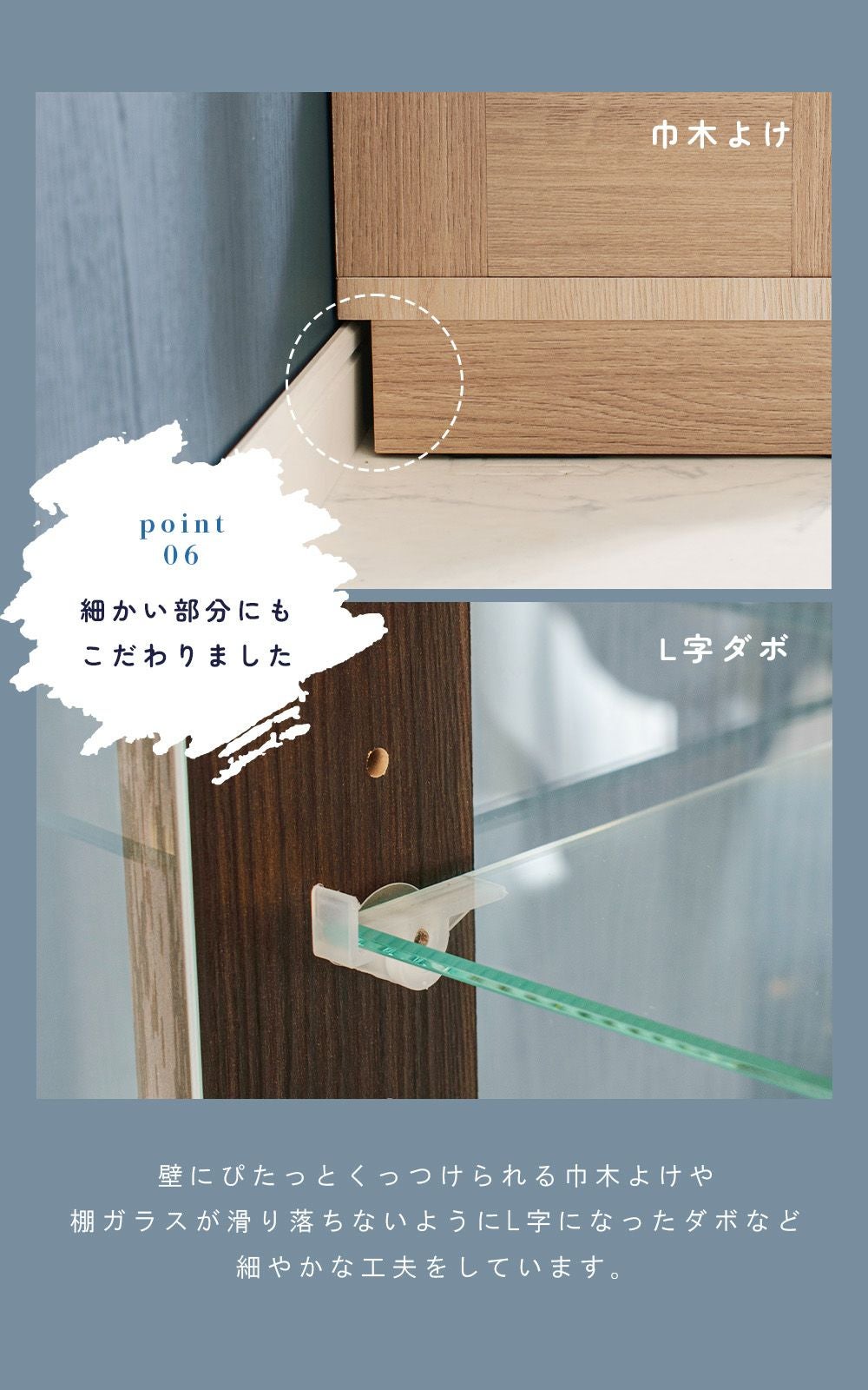 棚受けにはL型ダボを採用し、地震の揺れなどで棚ガラスがズレることを防ぎ、安定したディスプレイを実現。