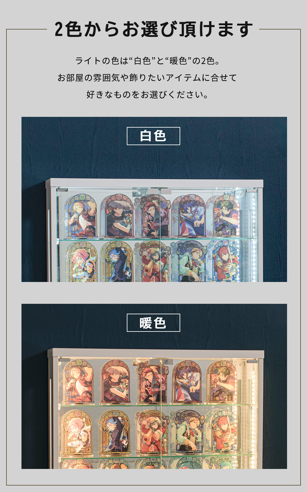 幅40 奥行16cm 高さ42cm 棚ガラス 棚板 ライト LED 完成品 増やせる収納 カスタム ひな壇 ディスプレイ 展示ケース 白 黒 グレージュ ウォールナット ホワイト ブラック アクスタ 推し活 コレクションケース 幅42cm 薄型 [スリム2個セット] フィギュアケース オタ活 高品質 コレクション ボックス 積み重ね可能 扉付き 透明 ガラス コレクションボックス 収納 段差式 [セルマ]