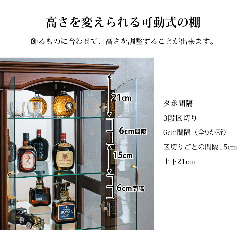 • 強化ガラス扉+可動式ガラス棚3枚付き で安全性とディスプレイの自由度を両立