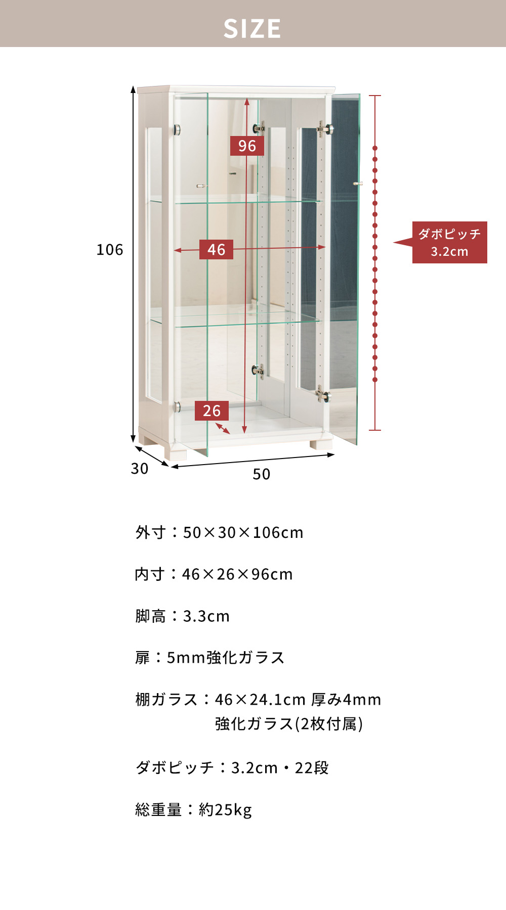 • 外寸:幅50×奥行30×高さ106cmなので、設置面積を抑えつつ、縦方向にしっかり飾れてコレクション量にも対応しやすい
