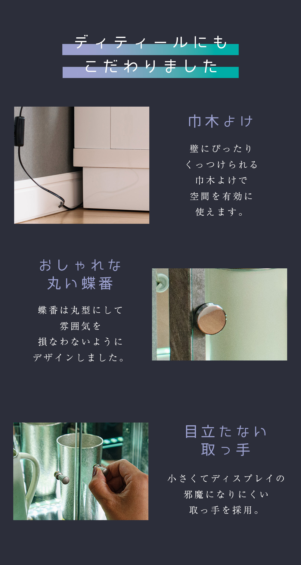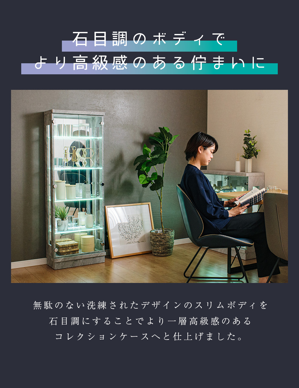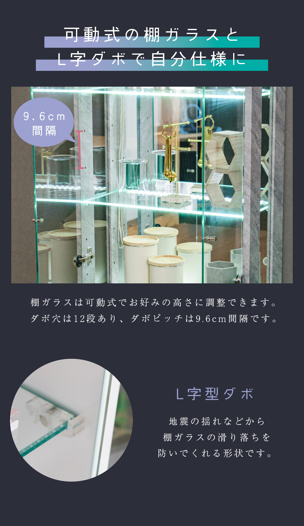 • 背面ミラー貼りなので、奥行き感が出てコレクションが立体的に映え、展示の見栄えを底上げできる