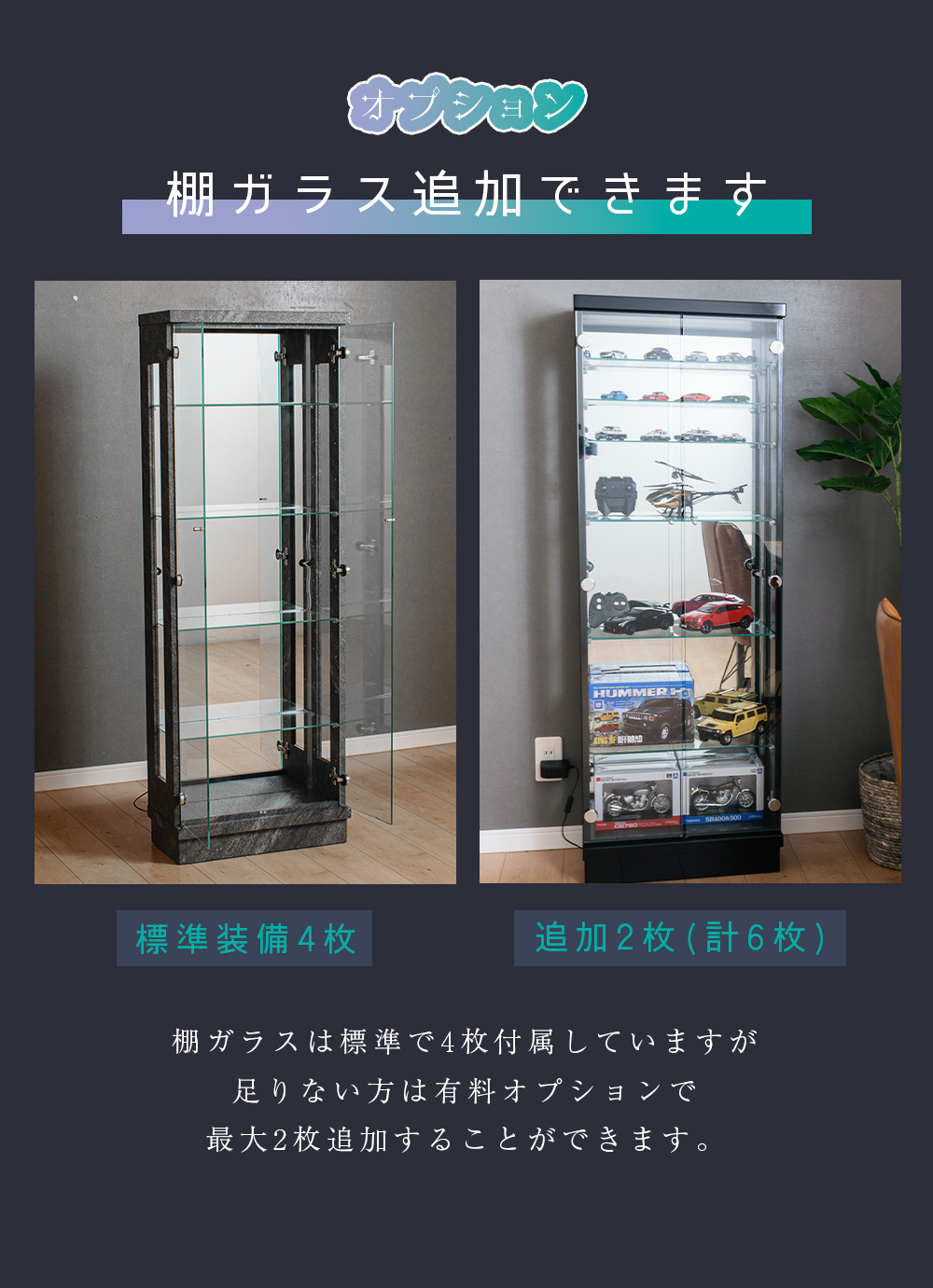 • 扉は5mm強化ガラスで安心感があり、棚は5mmガラス(移動式)4枚標準装備なので、最初から段数を作って整理しながら飾りやすい