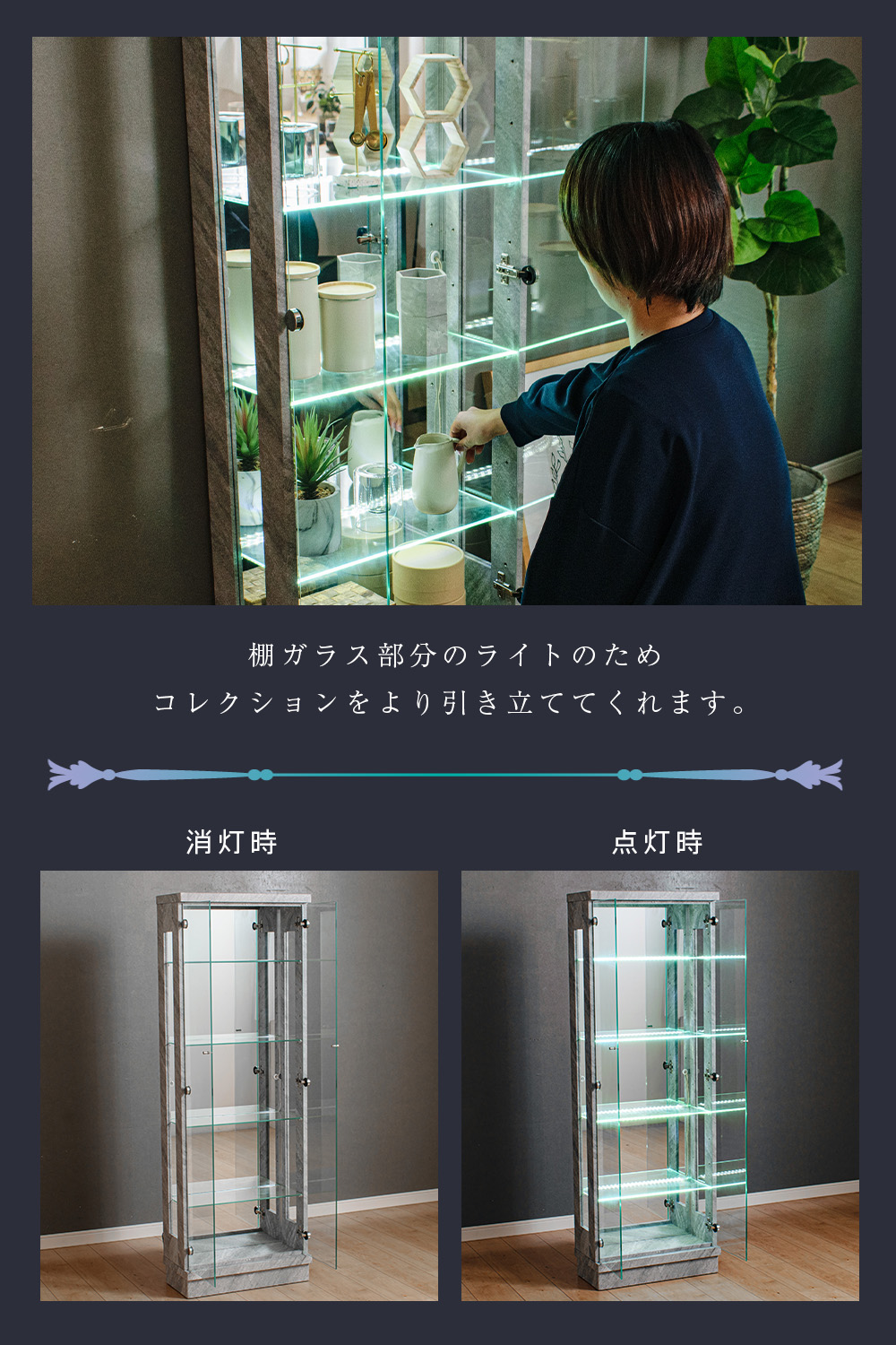 • 棚ガラス奥にライトがある仕様で、コレクションを“光で映えさせる”展示ができるのが強みのコレクションケース