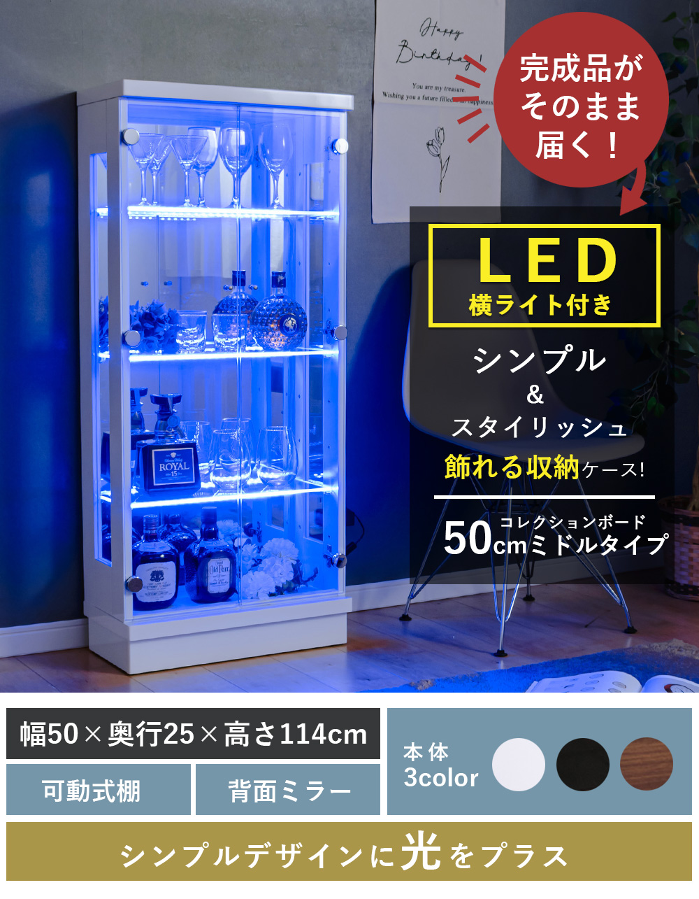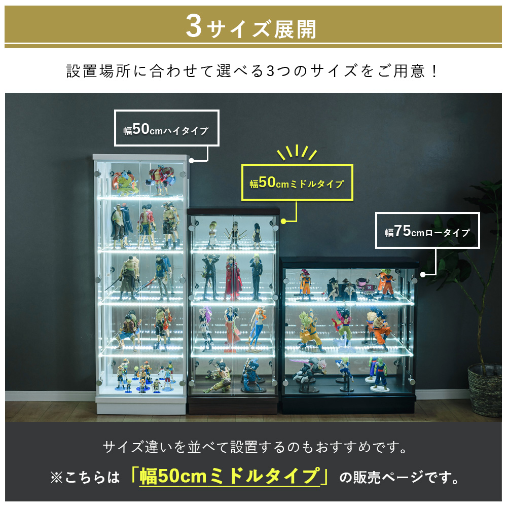 - 外寸は幅50×奥行25×高さ114cmなので、奥行きを取りすぎず置きやすいサイズ感のまま、ミドルタイプとしてしっかり飾れる