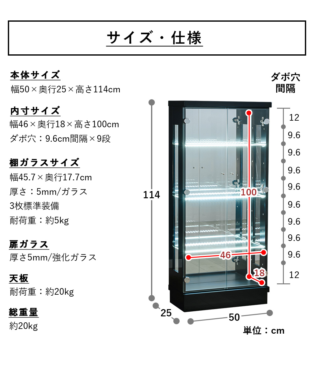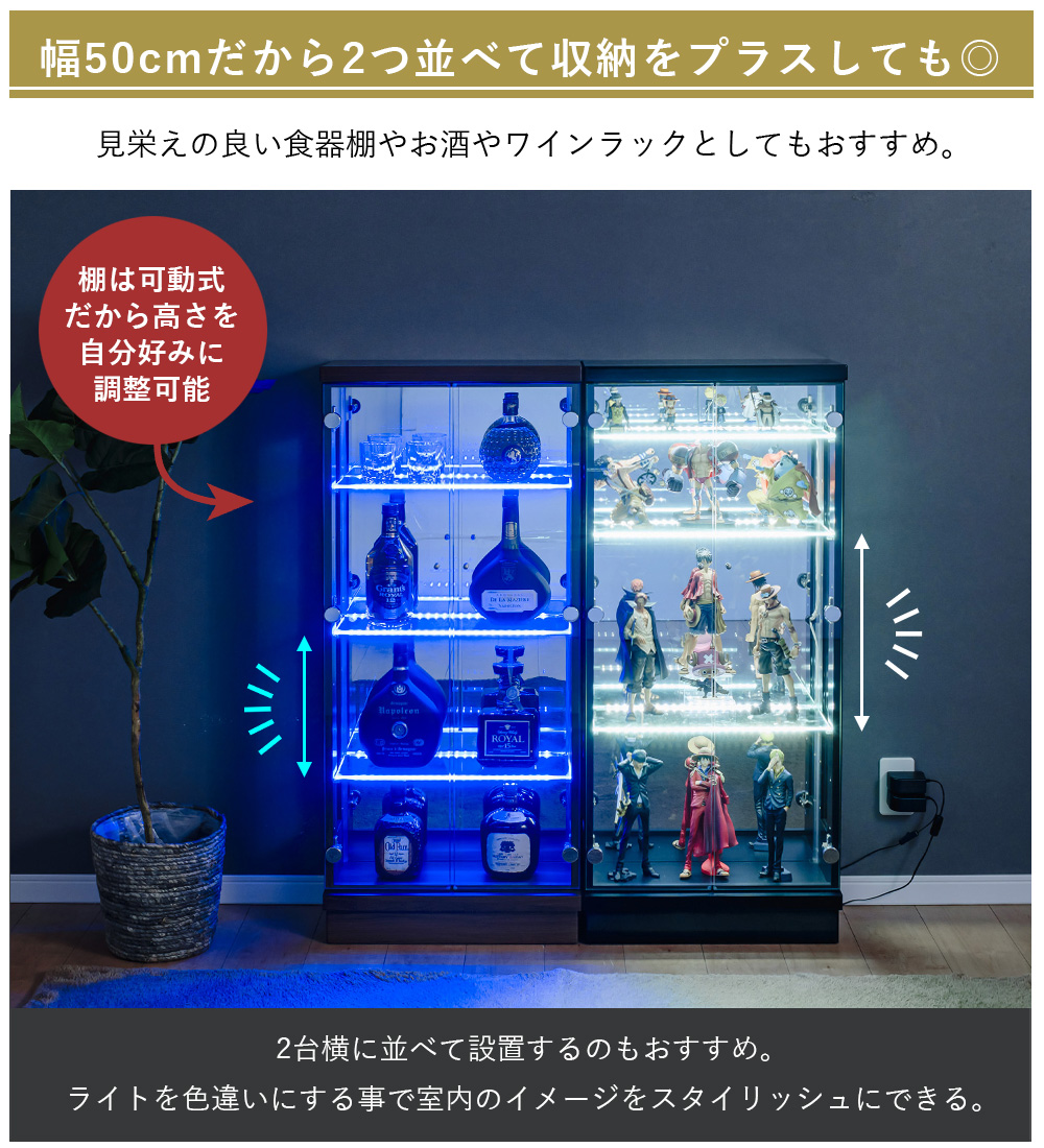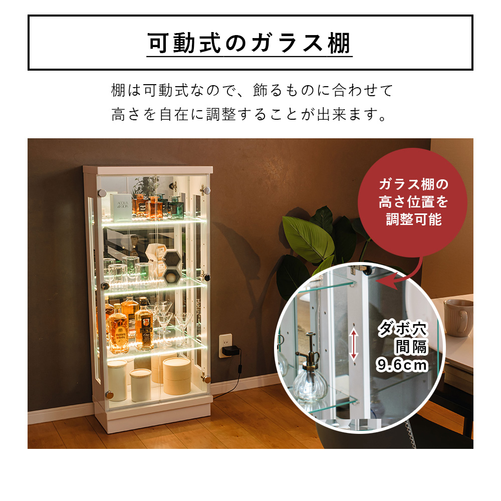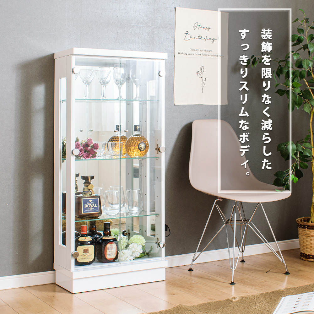- 内寸は幅46×奥行18×高さ100cmあり、フィギュアやボトル類なども並べやすく、見せる収納として使い勝手がいい