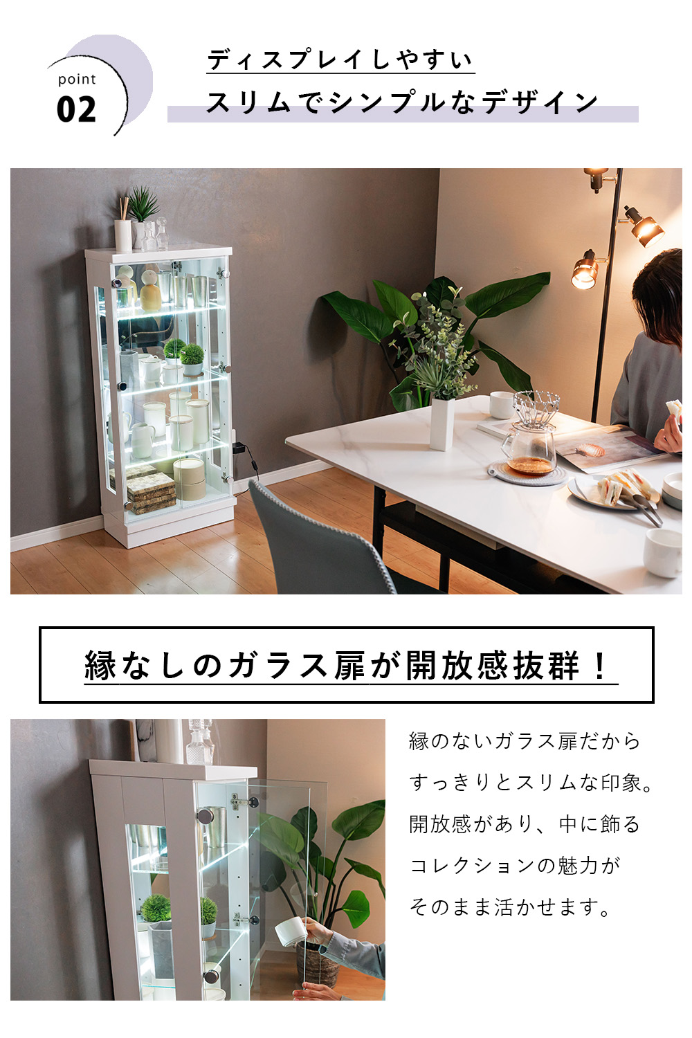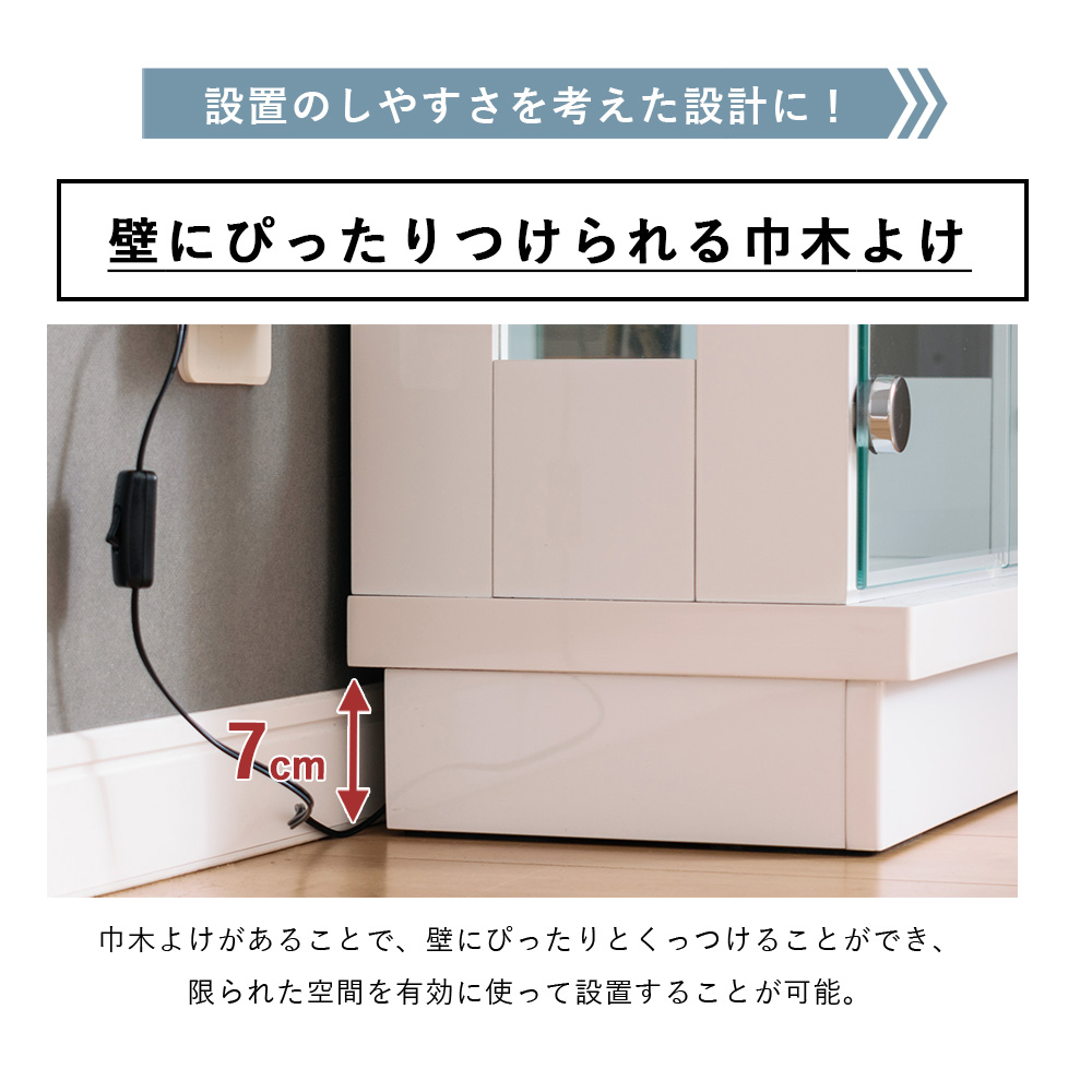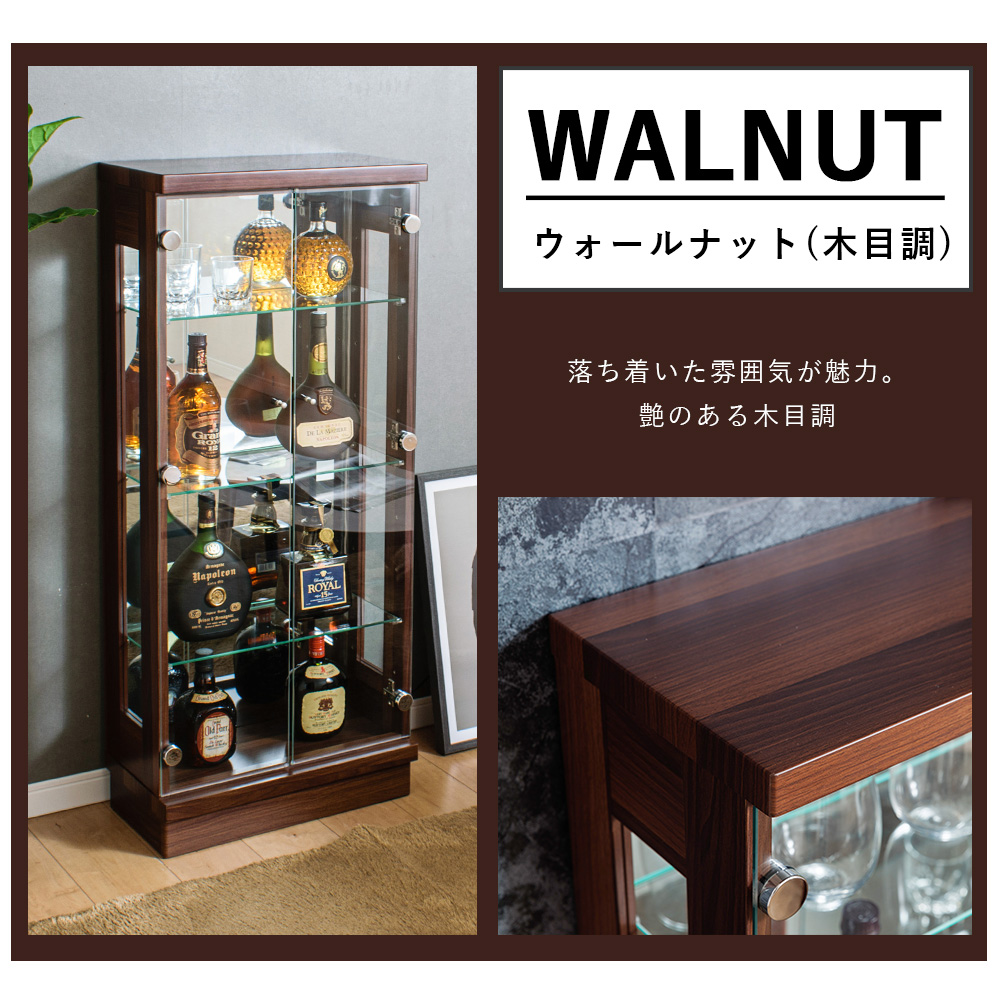 - 内寸は幅46×奥行18×高さ100cmあり、フィギュアやボトル類なども並べやすく、見せる収納として使い勝手がいい