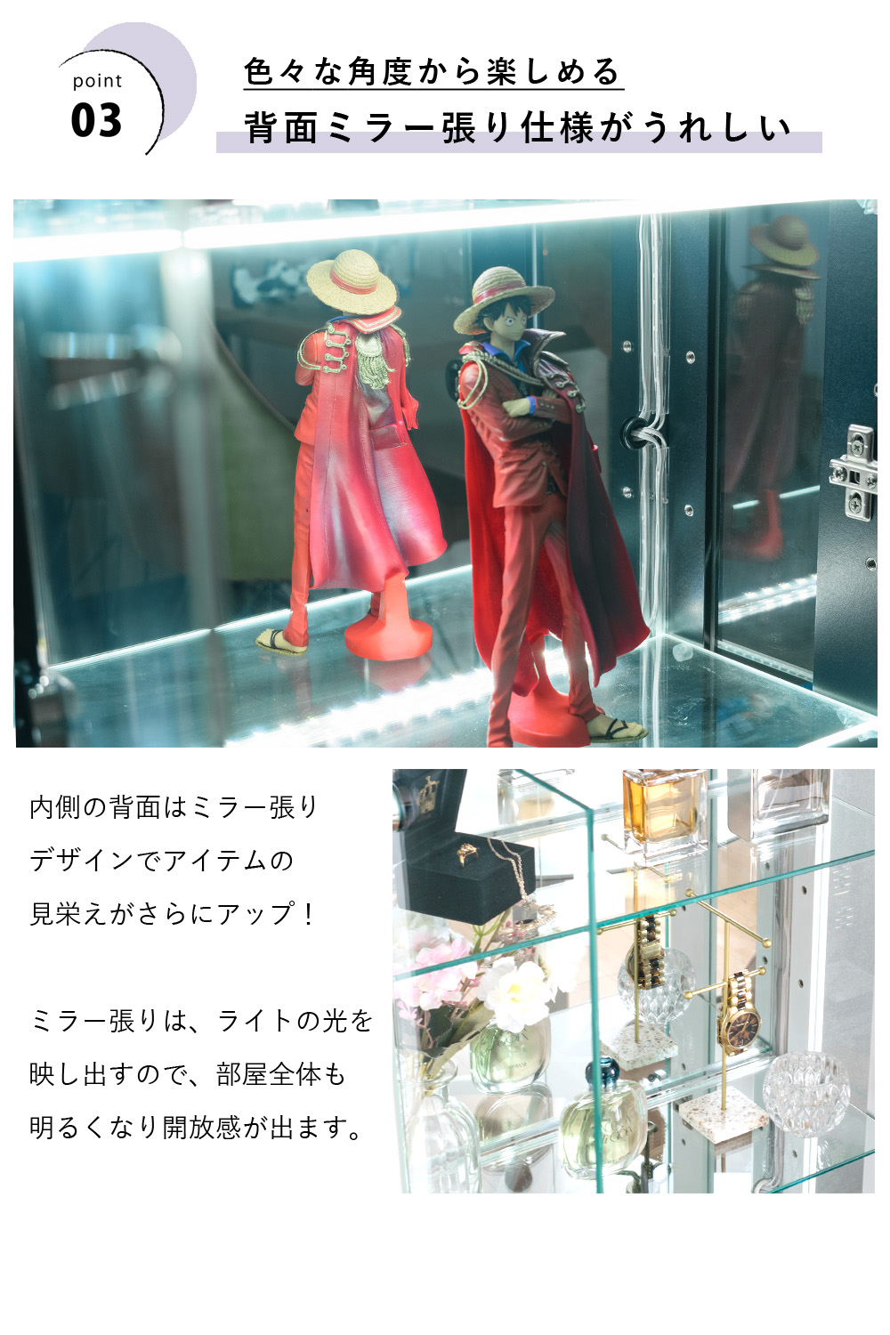- 背面ミラー貼りなので、奥行き感が出てコレクションが立体的に映え、展示の見栄えを底上げできる