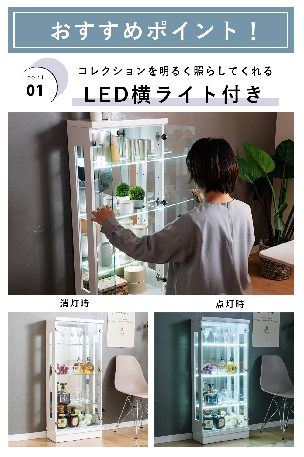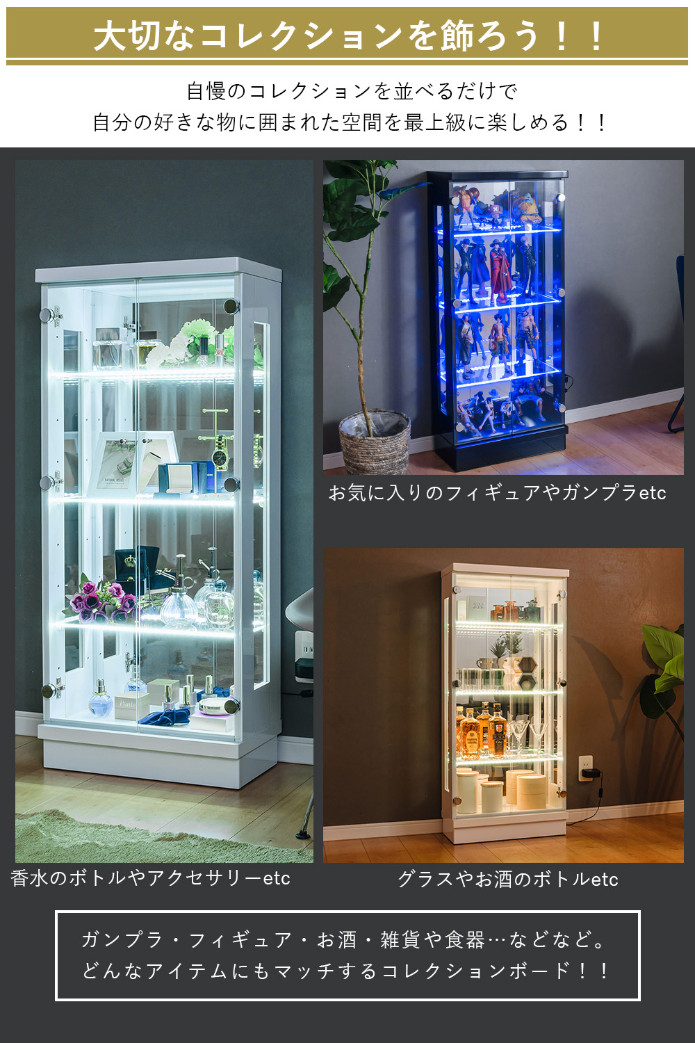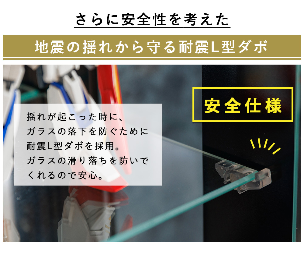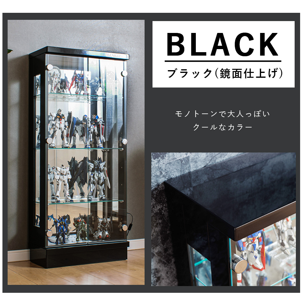 - 棚ガラス奥にライトがある仕様で、コレクションを“光で映えさせる”展示ができるのが強みのコレクションケース