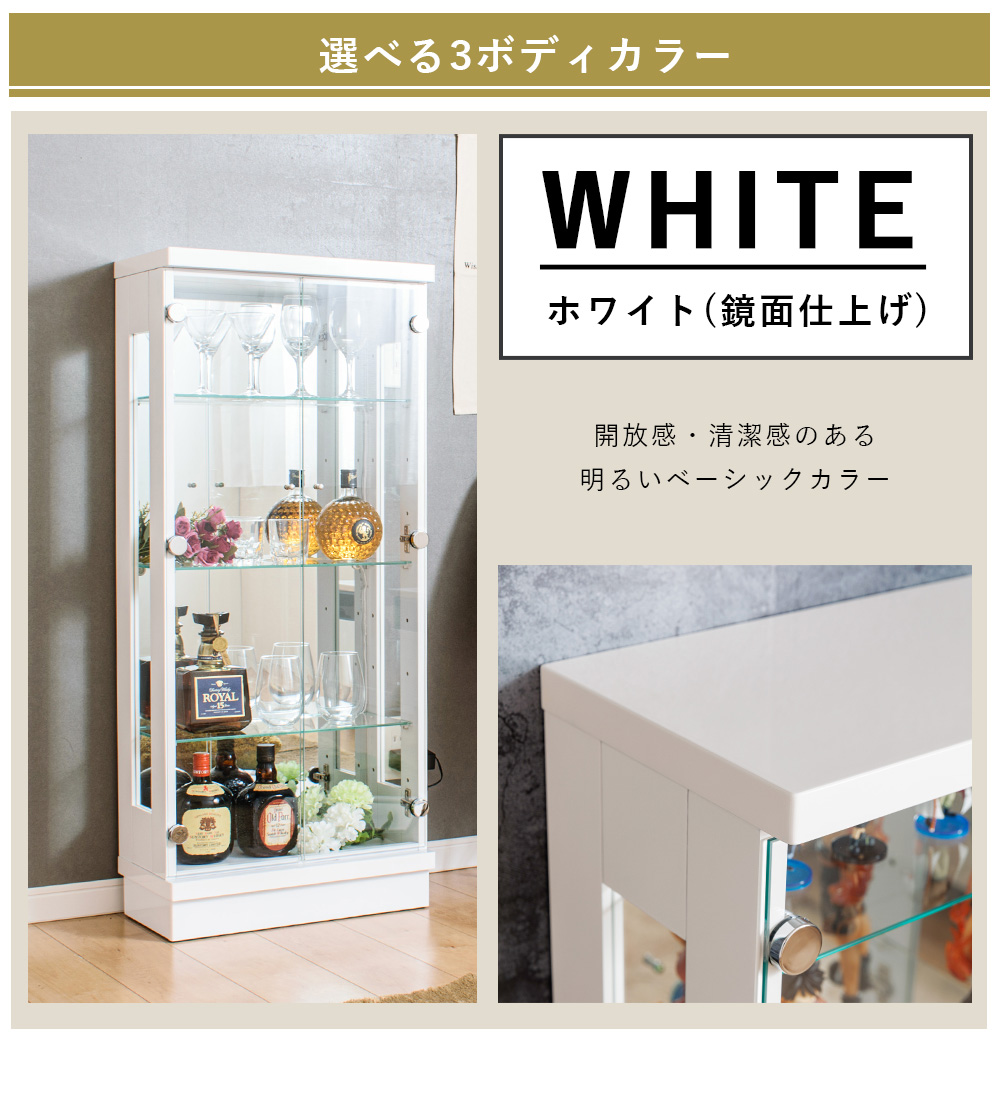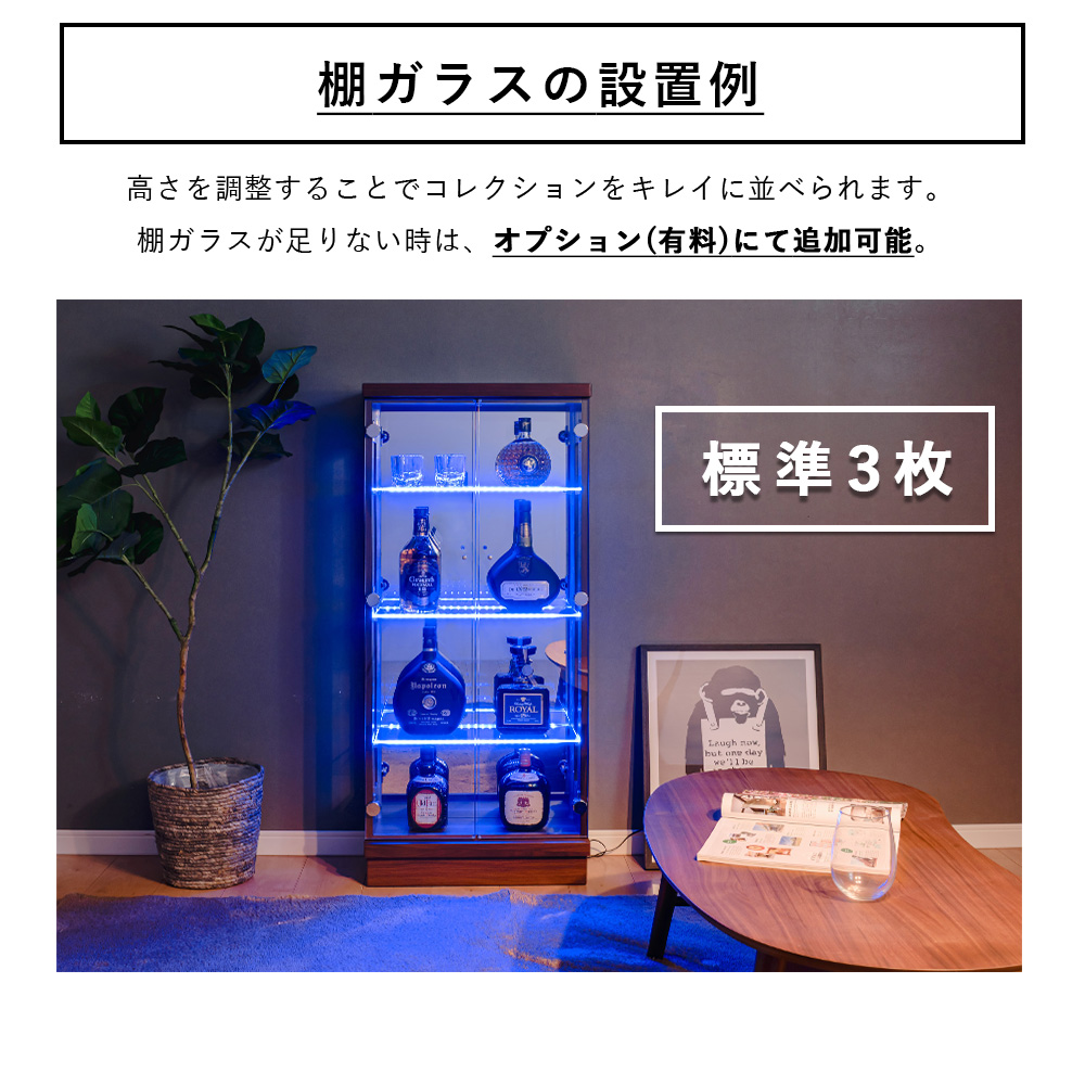 【開梱設置付き / 完成品】 選べる 横ライト カラー コレクションボード ガラス 展示用 ホワイト ブラック ウォールナット フィギュア ウィスキー 骨董品 ディスプレイ ミドルタイプ