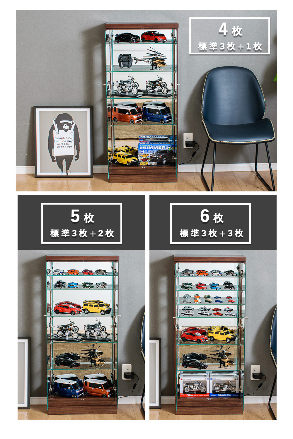 - 扉は5mm強化ガラスで安心感があり、棚は5mmガラス(移動式)3枚標準装備なので、最初から段数を作って整理しながら飾りやすい
