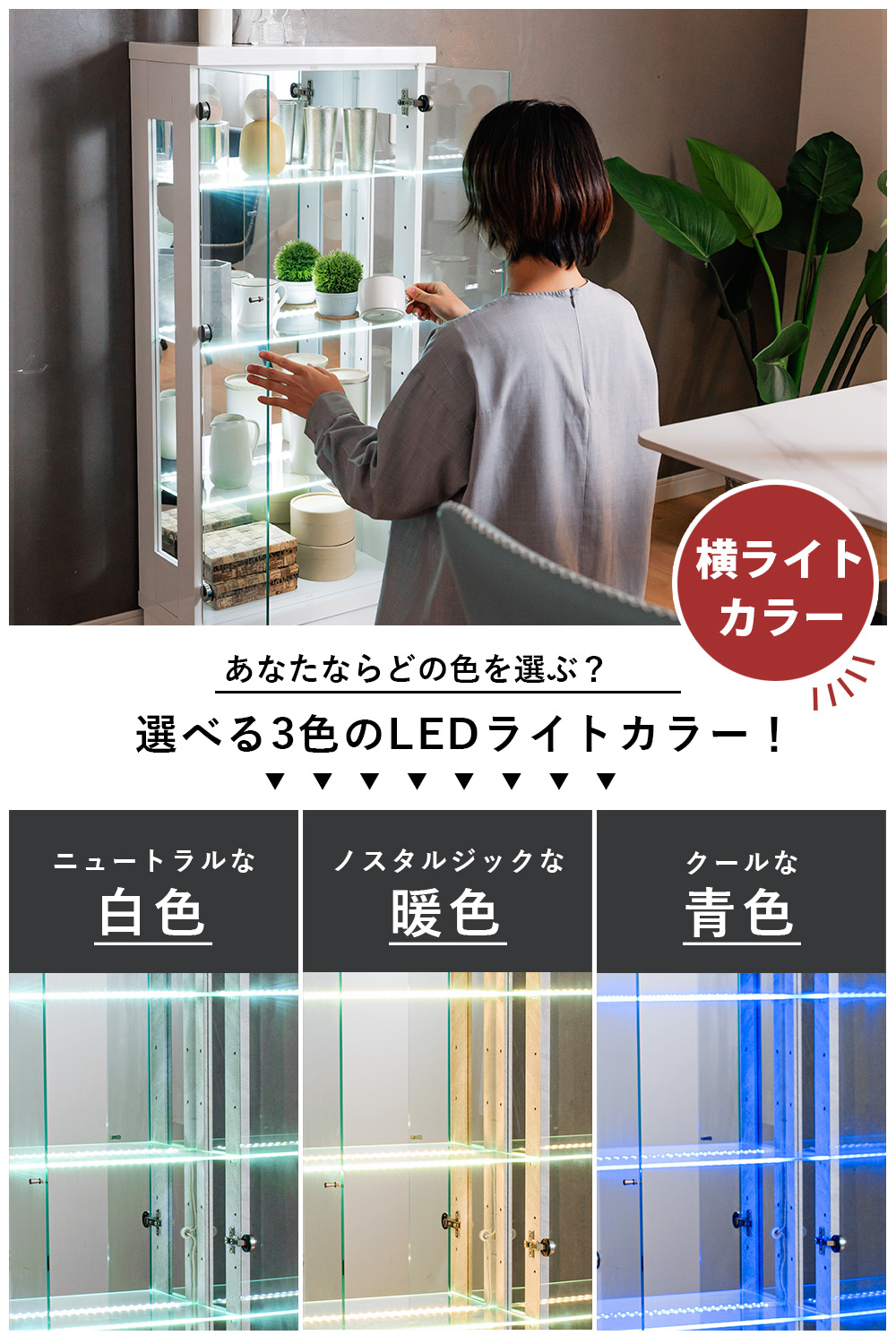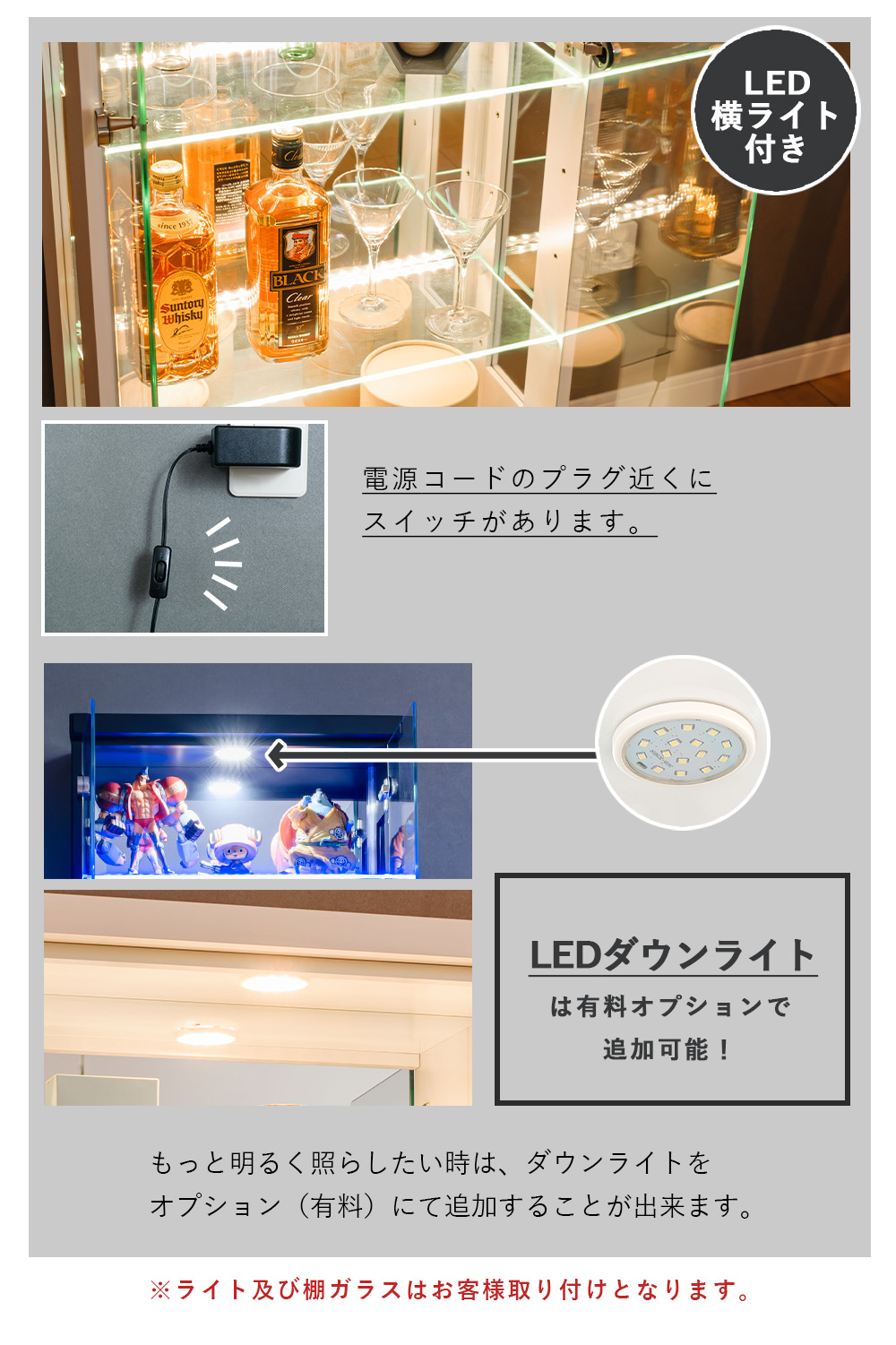 - LEDライト(横ライト)付き:棚ガラス奥に1本ずつライトがあり、展示物を明るく見せて存在感を出しやすい(ライトカラーは白色/暖色/青色から選択)