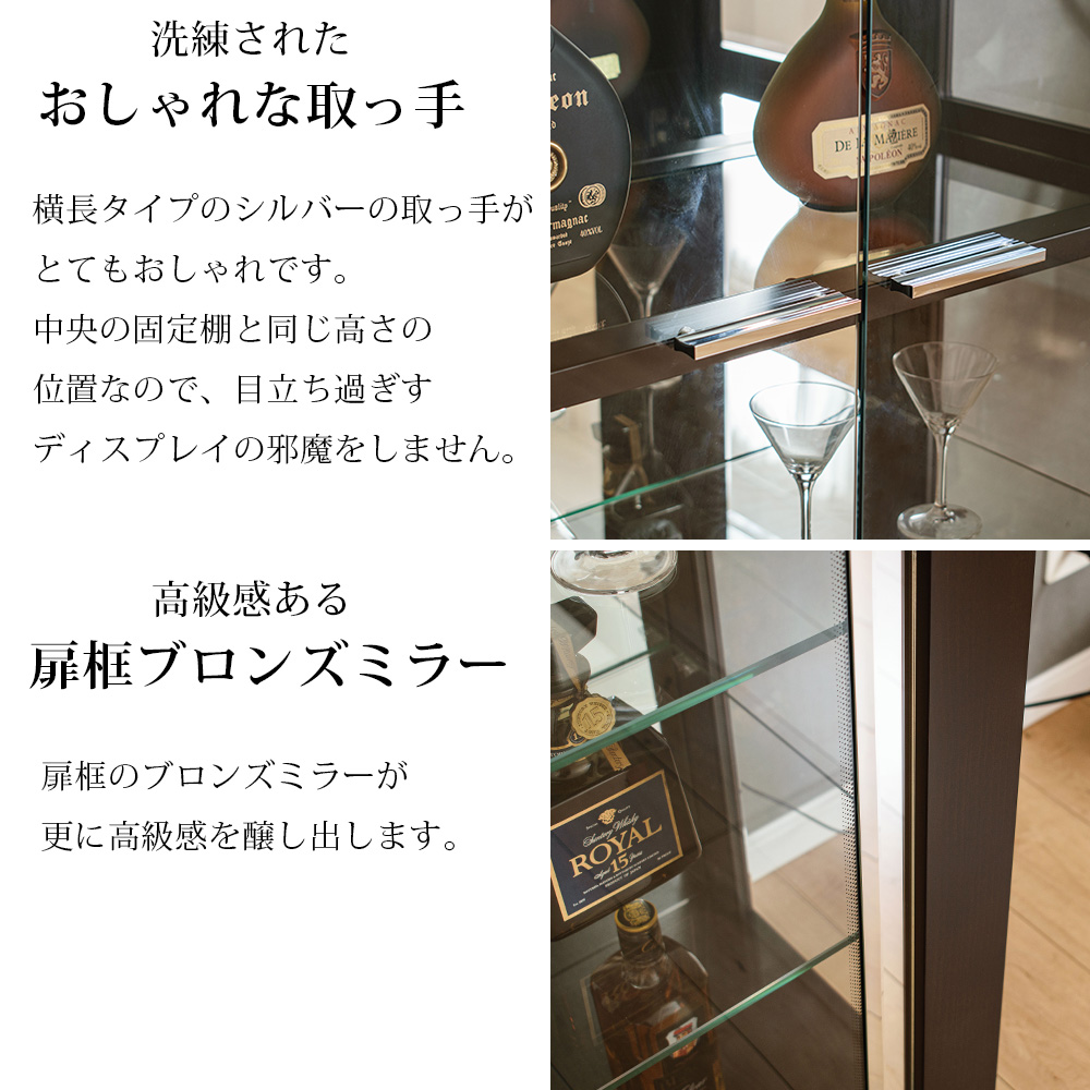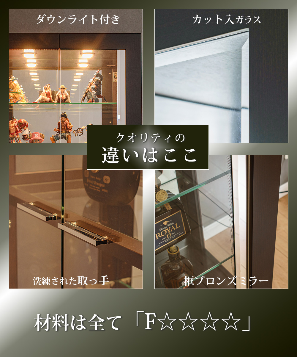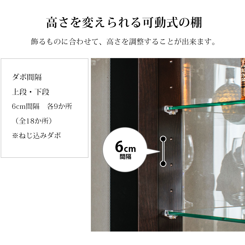 • 強化ガラス棚多数装備(可動式ガラス棚4枚+中段1枚)でディスプレイの自由度高い仕様