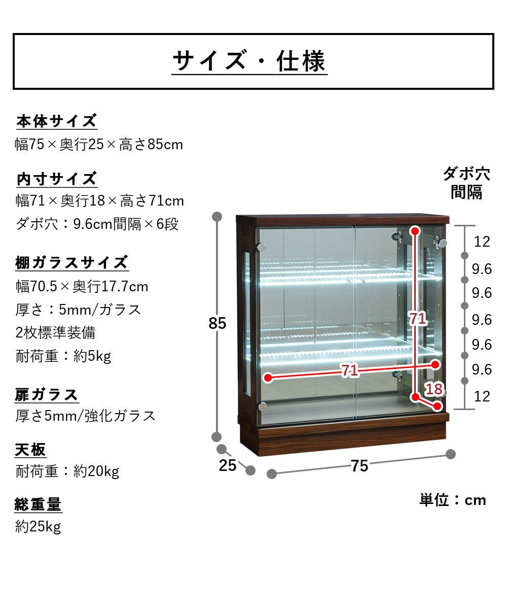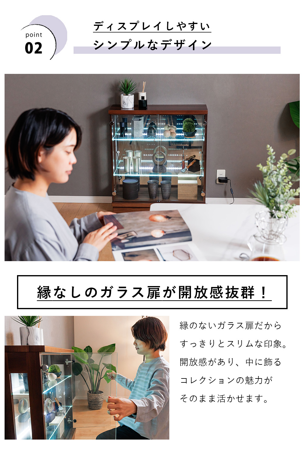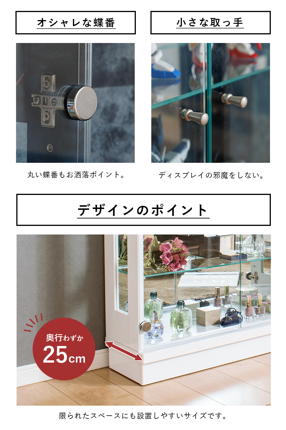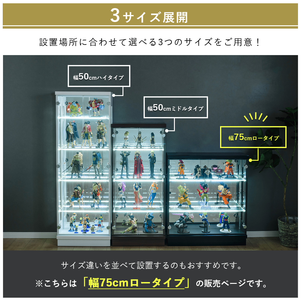 - 幅75×奥行25×高さ85cmのロータイプだから、圧迫感を抑えつつ横に広くコレクションを並べやすい