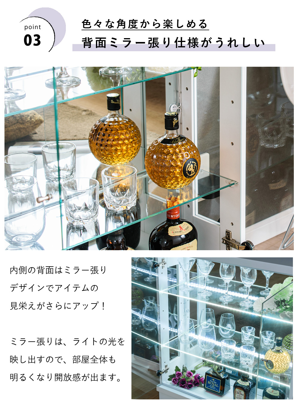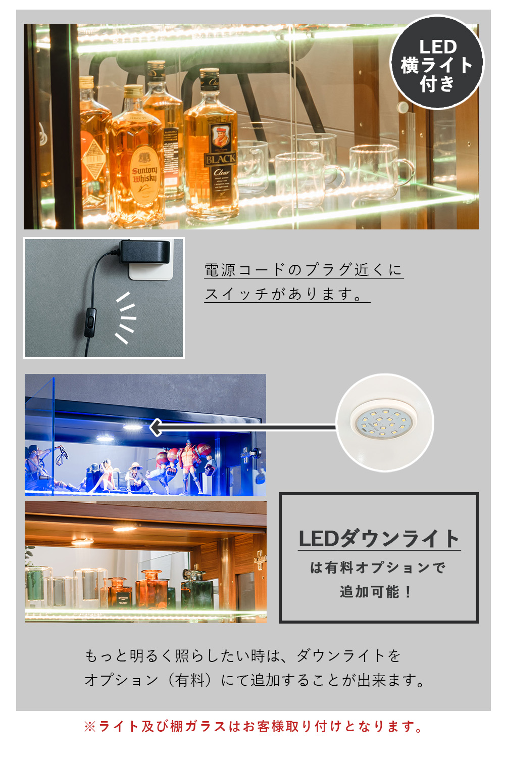 - 追加棚ガラス(LED横ライト付き)や追加LEDダウンライトのオプションがあり、コレクション量や演出に合わせて拡張しやすい