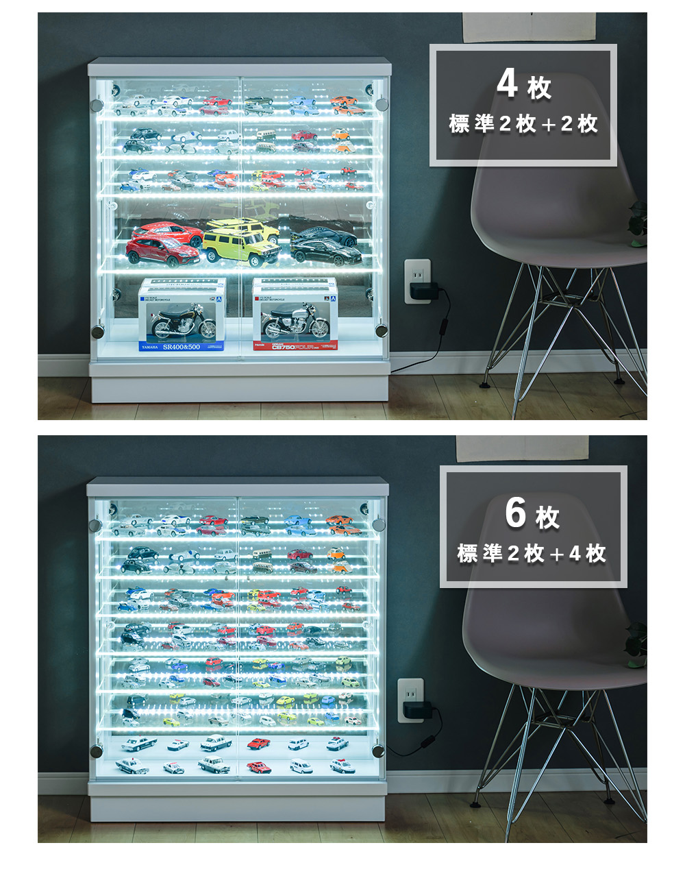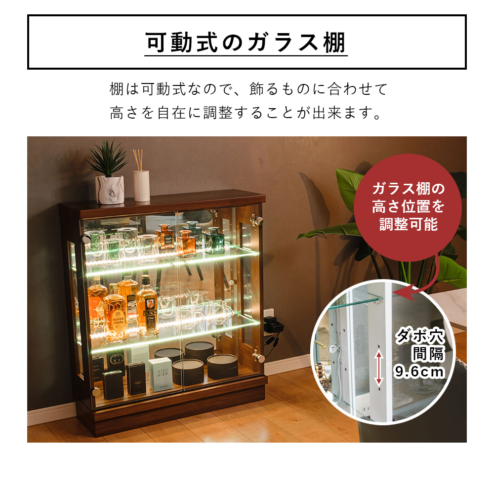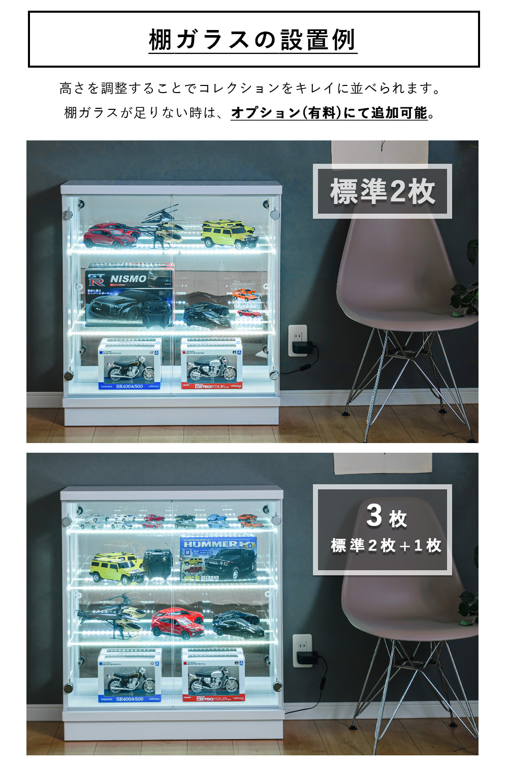 - 可動棚ガラス(5mm)2枚が標準装備なので、買った時点で段分けして整理・展示しやすい