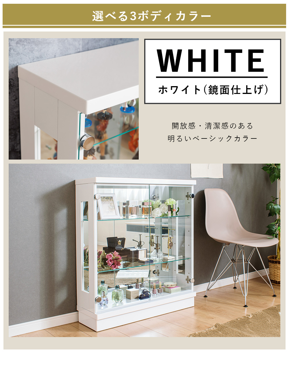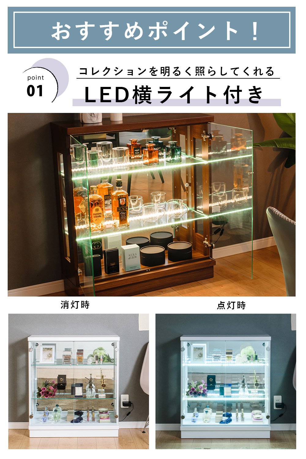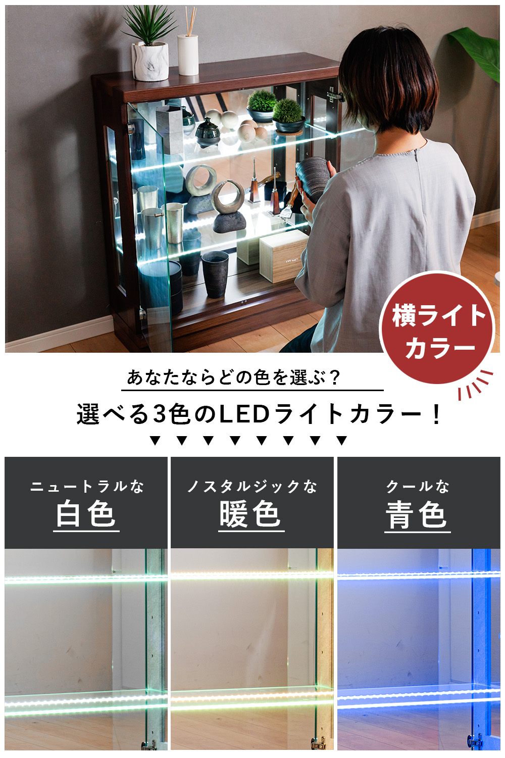 - 棚ガラスの奥側に1本ずつのLEDライト付き。白色、暖色、青色3色の中からお選び頂けます。