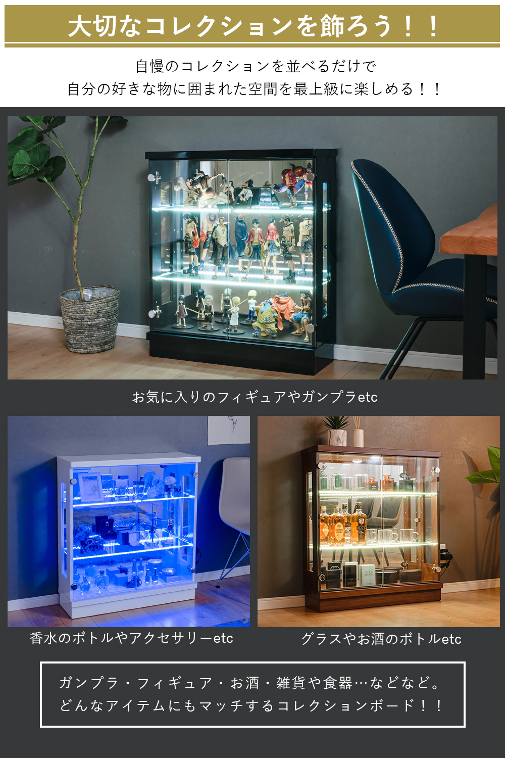 【開梱設置付き / 完成品】 選べる 横ライト カラー コレクションボード ガラス 展示用 ホワイト ブラック ウォールナット フィギュア ウィスキー 骨董品 ディスプレイ ロータイプ